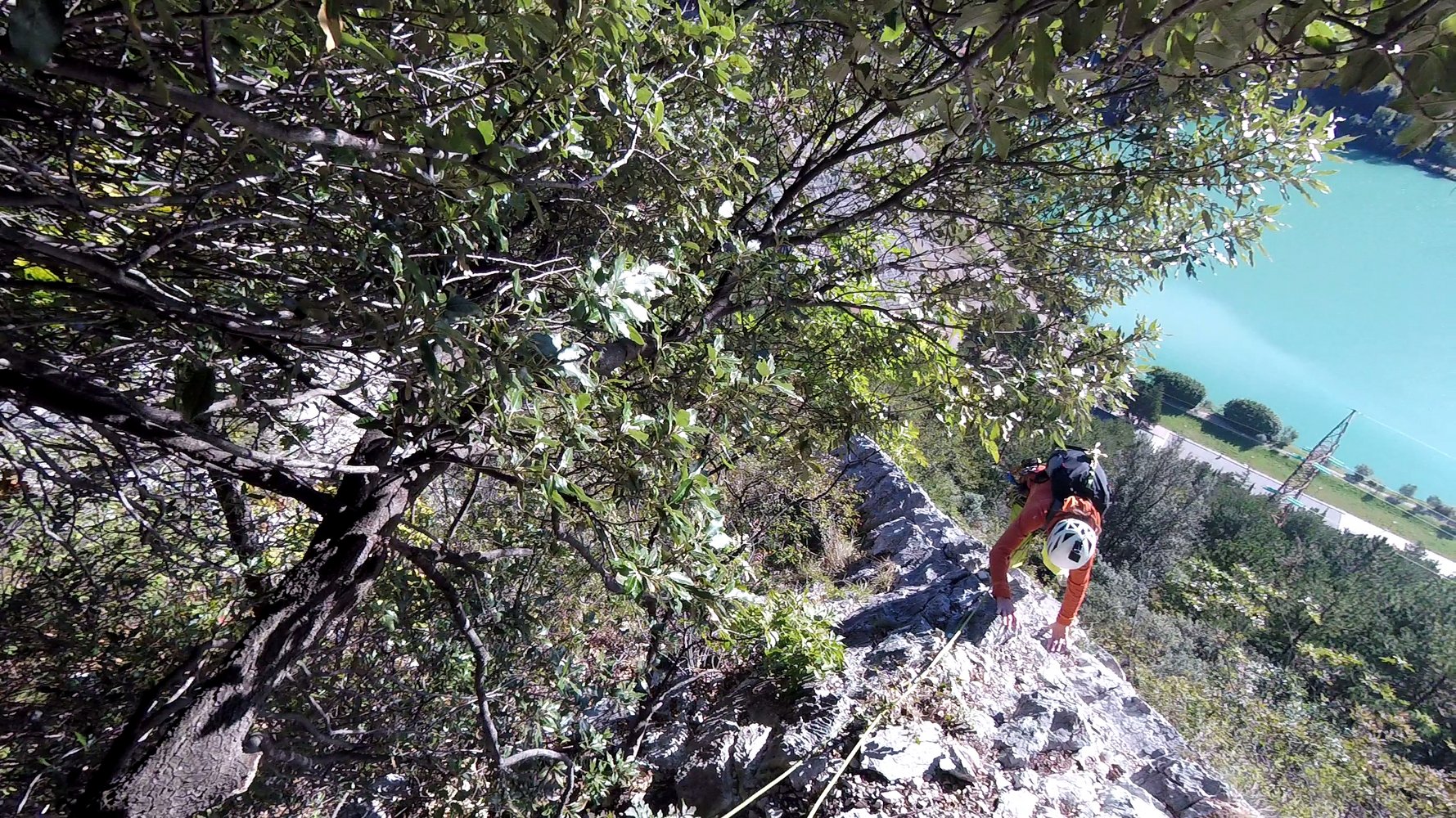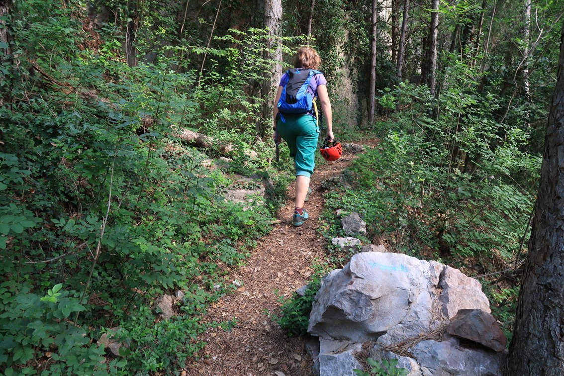 Vom Ausstieg auf dem Pfad aufwärts, es kommt ein Pfad von links dazu, man steigt bis zu einem Felsspalt auf. Durch den Spalt, dann etwas abwärts, danach flach bzw. leicht ansteigend lange queren. Man kommt zu einem Abbruch, dieser ist mit einem Stahlseil und Eisenleitern gesichert (Mini-Klettersteig). Danach folgt man dem Pfad hinunter nach Massenza und geht durch den Ort zurück zum Parkplatz beim E-Werk.