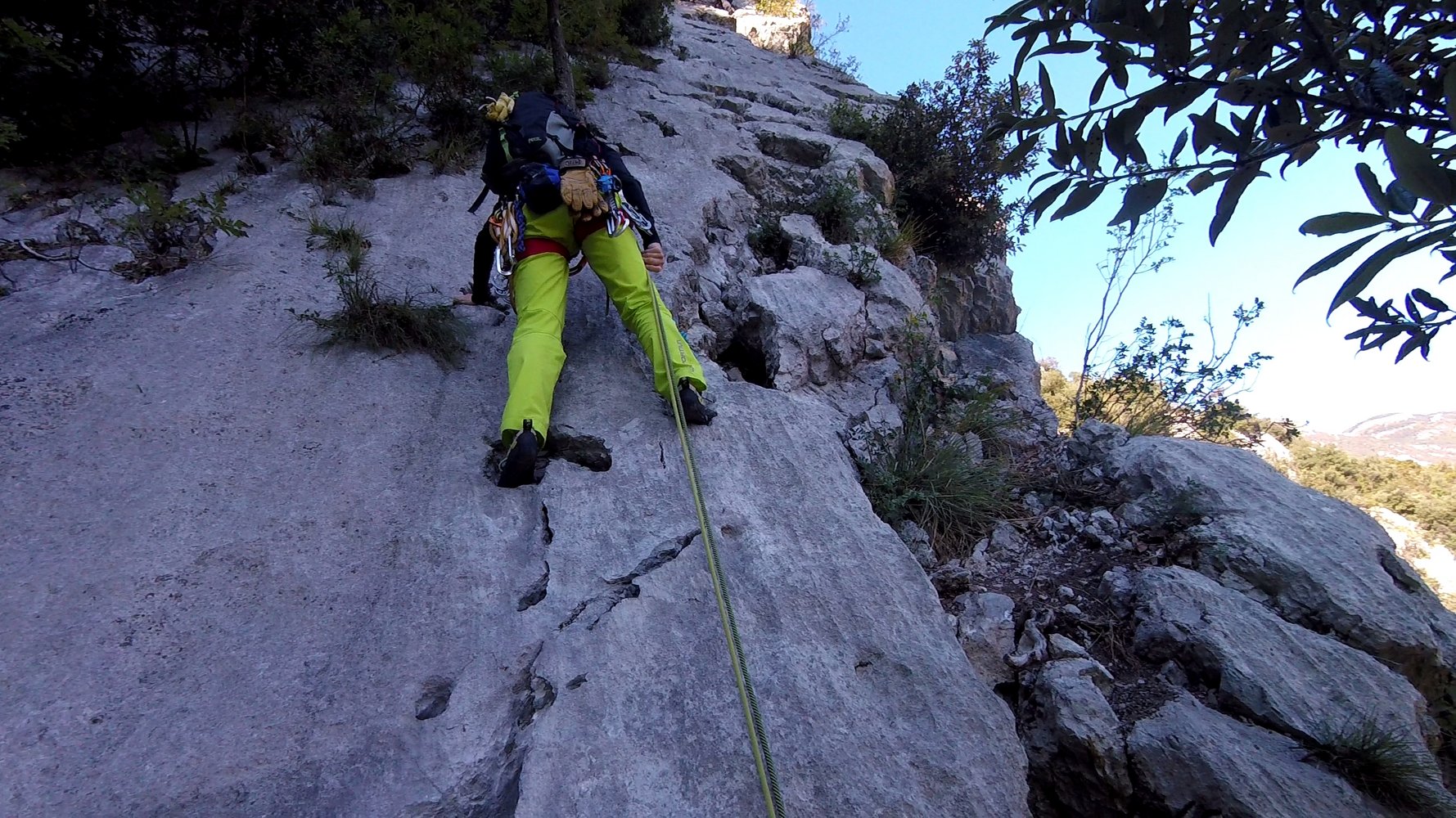 Die Tour ist gut mit wenigen Bohrhaken und sehr vielen Sanduhren gesichert. Außer Bandschlingen (zum eventuellen nachbessern der Sanduhren) und 11 Expressschlingen ist kein Material nötig.