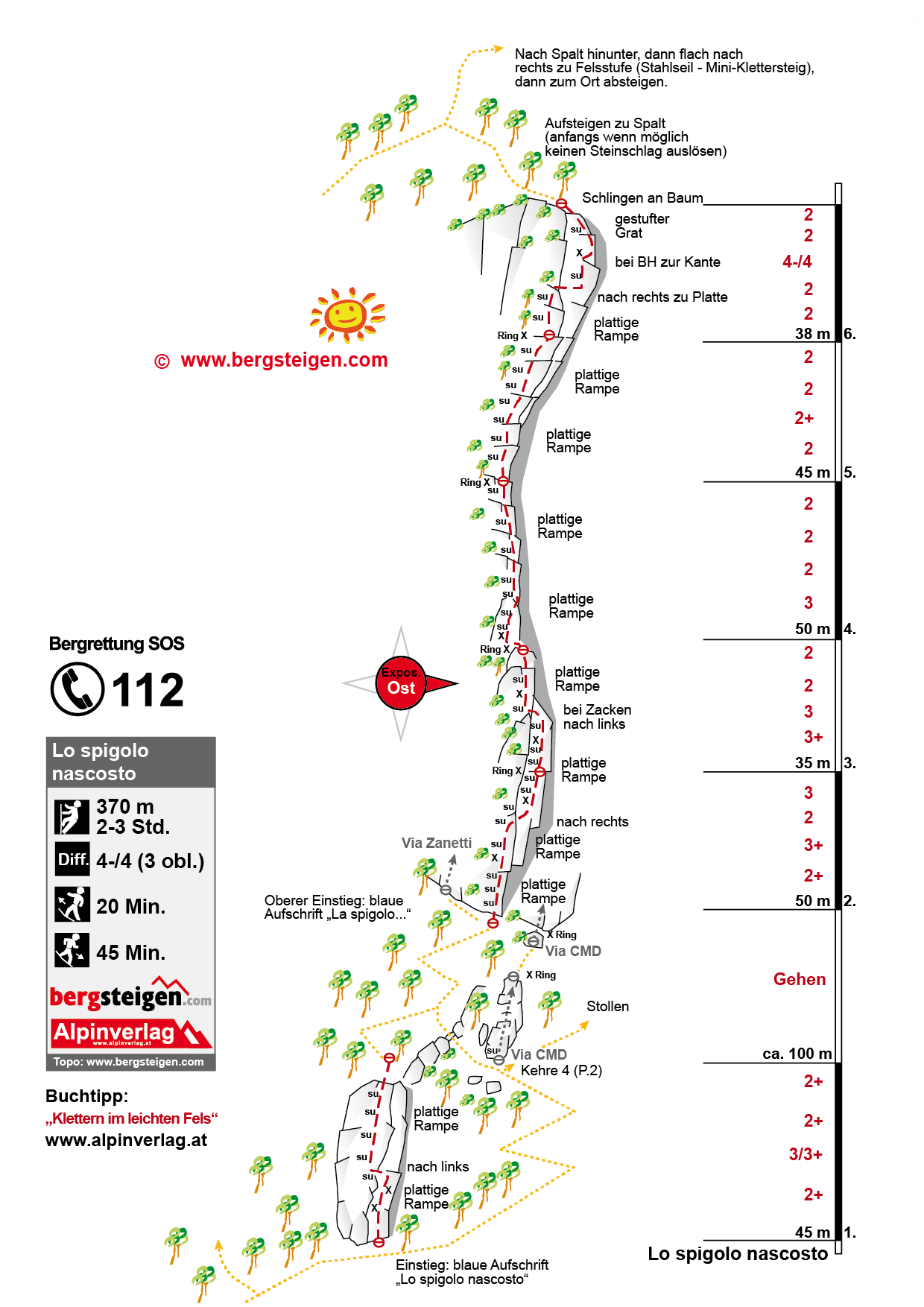 Vom E-Werk in Richtung Ortschaft, gleich nach den ersten Häusern nach links hinauf in Richtung Ranzo. Man folgt dem Weg etwas, zweigt unterhalb der Felsen nach rechts zum Klettergarten ab (nicht den ersten Weg nach rechts nehmen!). Man folgt dem Pfad am Klettergarten vorbei und gelangt zum Einstieg, der untere Pfeiler ist direkt am Pfad. Wer weiter oben einsteigen will, der folgt dem Pfad bis zur 4ten Kehre und zweigt dort links zum Einstieg ab.