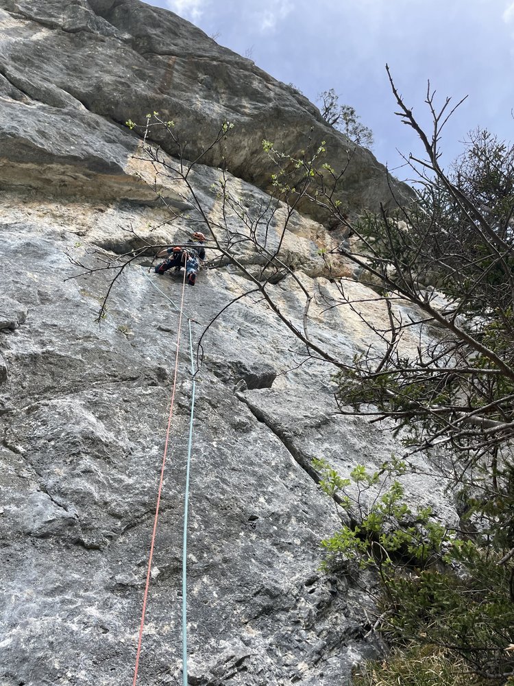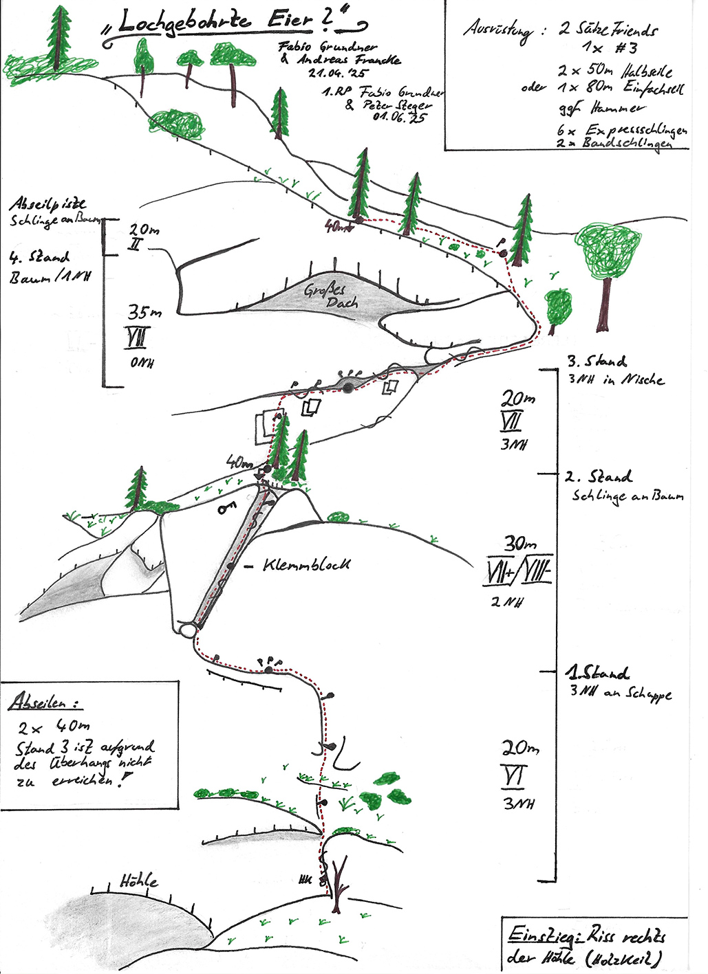 80 m Einfachseil oder 2x 50m Halbseile, 2 Sätze Friends (einmal Größe 3), Helm, komplette MSL Ausrüstung