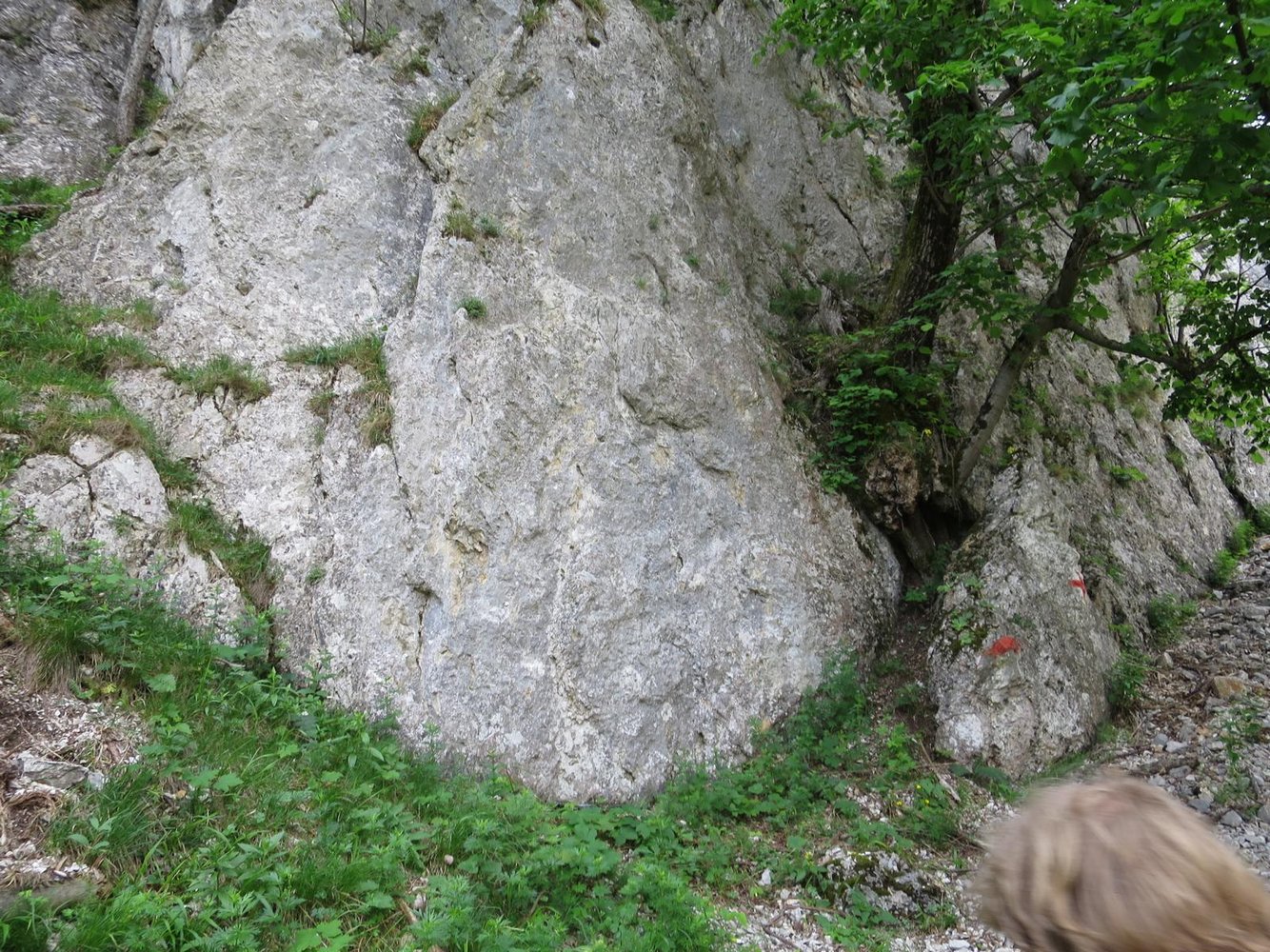 Nach der 12. u. 13 über den Zimmersteig, eine Stelle 3+ (Lachkabinett - ein enger Spalt, in den man sich reinwursteln muss) aussteigen. Er ist rot markiert.