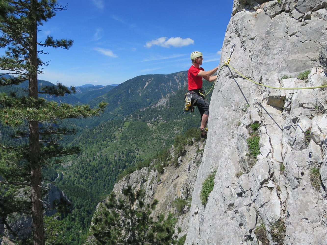 Der Fels ist raxtypisch oft splittrig und die 16. Länge hat Felssturzpotential; es ist aber alles perfekt mit Bohrhaken gesichert, lediglich in der 3. SL etwas weiter, was mit Friends gut entschärft werden kann. Dank der vielen Abbruchmöglichkeiten fehlt bei dieser Tour das alpine Flair.
