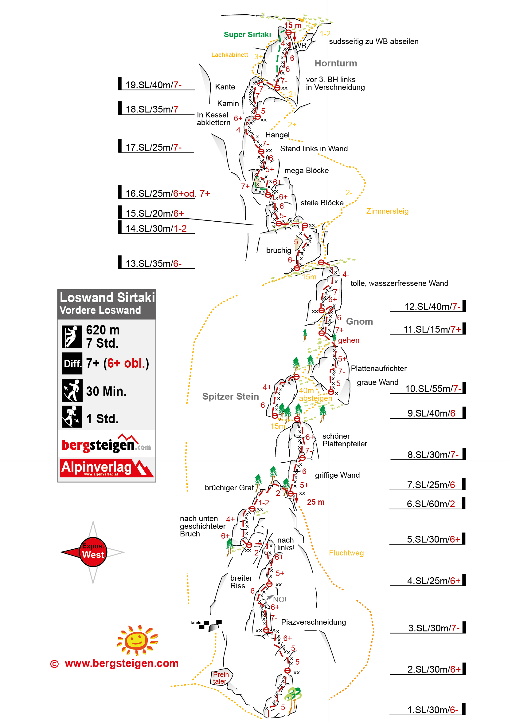Im Topo am Hornturm grün der Supersirtaki (ca. 8), der geht noch 2 SL in der linken Gipfelwand weiter, ist aber noch nicht freigegeben.