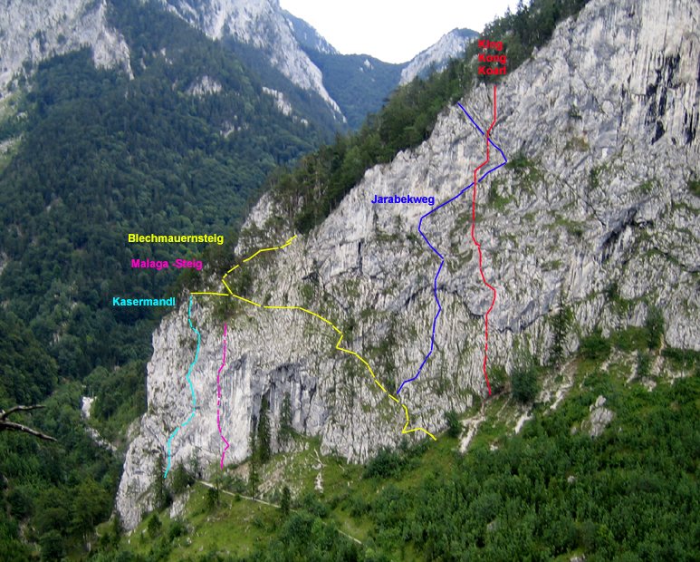 Ein Raxklassiker im neuen Gewand, die Route wurde vorbildlich mit Bohrhaken saniert. In Verbindung mit der Einstiegsvariante "Mailüfterl" eine super Route durch den doch recht glatten Plattenpanzer der äußeren Blechmauer. Steil und ausgesetzt in zwei wunderschönen Seillängen wird der Austieg erreicht von dem man unschwierig über den Blechmauernsteig in ca. 15 min wieder beim Rucksack ist. Diese Route ist eine gute Ergänzung zum King-Kong-Koarl 6+