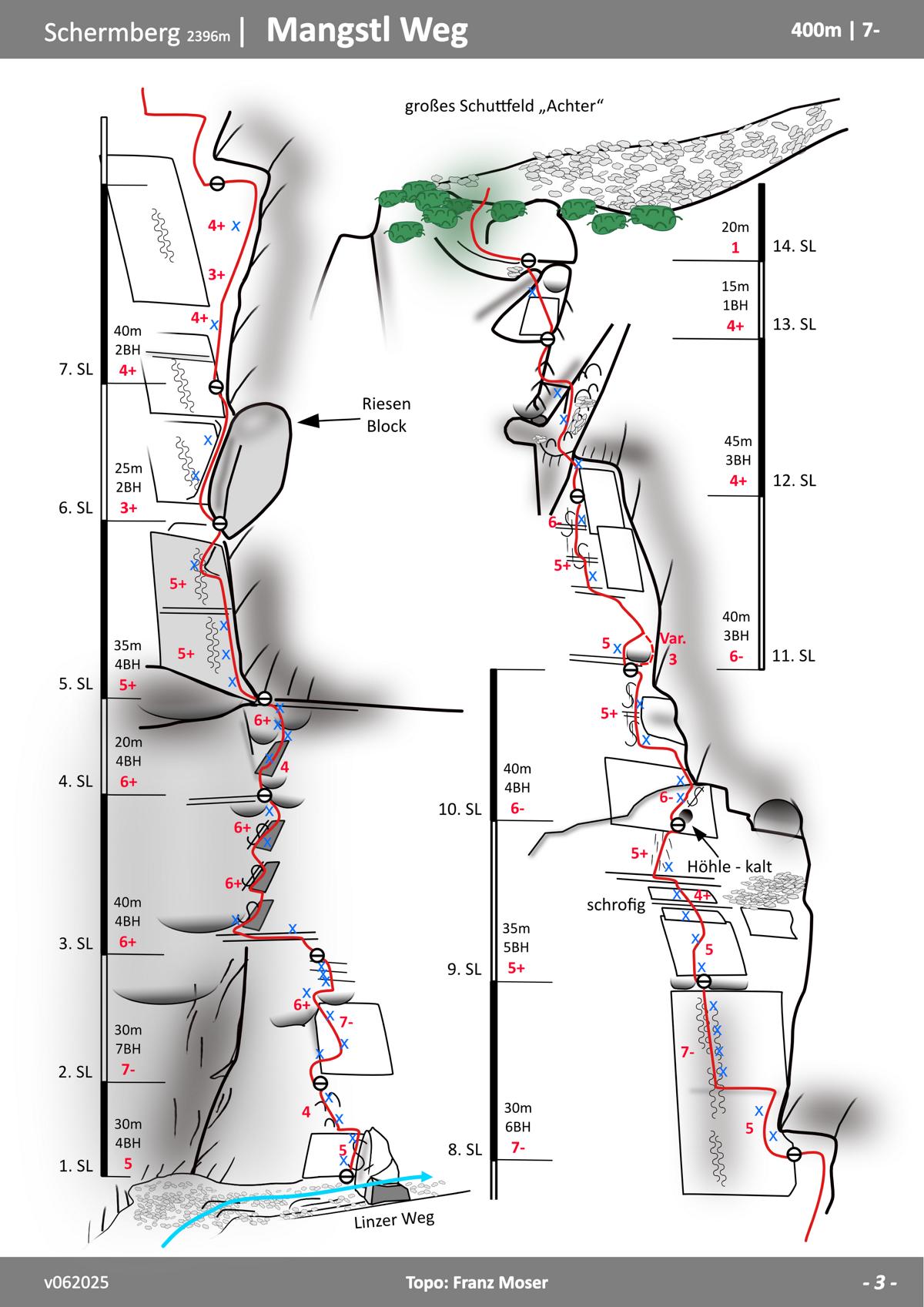 2.) über Zustieg „Schlossgespenst“: dem rechten Ast des Schuttstroms folgen und zum Beginn einer Schrofenrinne (N 47:43:21,5 / O 14:01:35,10) gehen. Über diese rund 300 Hm rauf bis unter die Wand (1 bis 2-). Oben nicht nach rechts zum Einstieg der Route „Schlossgespenst“, sondern links den Hang queren, bis er an einem abfallenden Rücken endet. Dort in den Schotterkessel, der die Verlängerung der Linzerschlucht bildet, absteigen. An der linken Kante der Wasserrinne eine Seillänge im 5. Schwierigkeitsgrad (Bohrhaken vorhanden) zum Eingang der Linzerschlucht hochklettern. Bei einem notwendig werdenden Rückzug ist diese Variante für den Abstieg empfohlen.