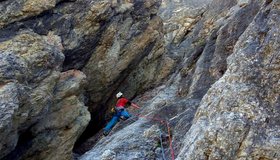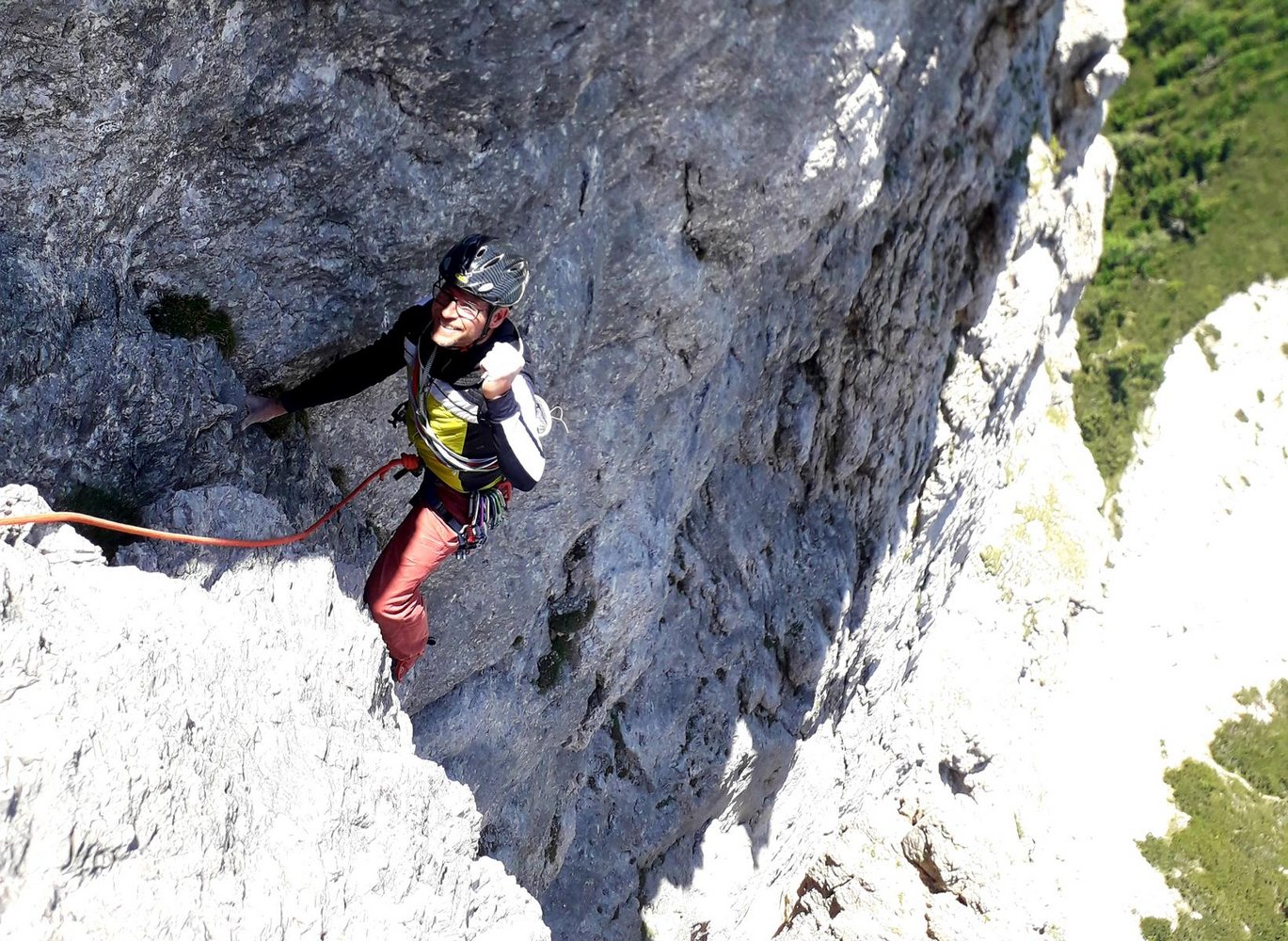 Die Absicht war, eine Route mit Bohrhaken zu eröffnen, wobei man doch weite Strecken im klassischen Gelände selbst absichern muss. Also keine Plaisierroute im herkömmlichen Sinn. Die Standplätze richteten wir jeweils mit Bohrhaken aus. An den Stellen wo Risse und Verschneidungen das Anbringen von mobilen Sicherungen erlaubten, verzichteten wir großteils auf das Bohren von Zwischenhaken. Auf diese Weise ist ein Sortiment Friends erforderlich. Insbesondere in den Seillängen Nr. 4,5 und 6 hat die Route klassischen Charakter und Linienführung. Die 7. Seillänge ist die Schlüsselstelle, die zwingend frei geklettert werden muss. Trotz einiger Bohrhaken sollte man recht konzentriert und vorsichtig über den bauchigen Wulst klettern. Nach dem grasigen Band gibt es zum Ende noch eine lohnende letzte Seillänge in sehr gutem Fels.