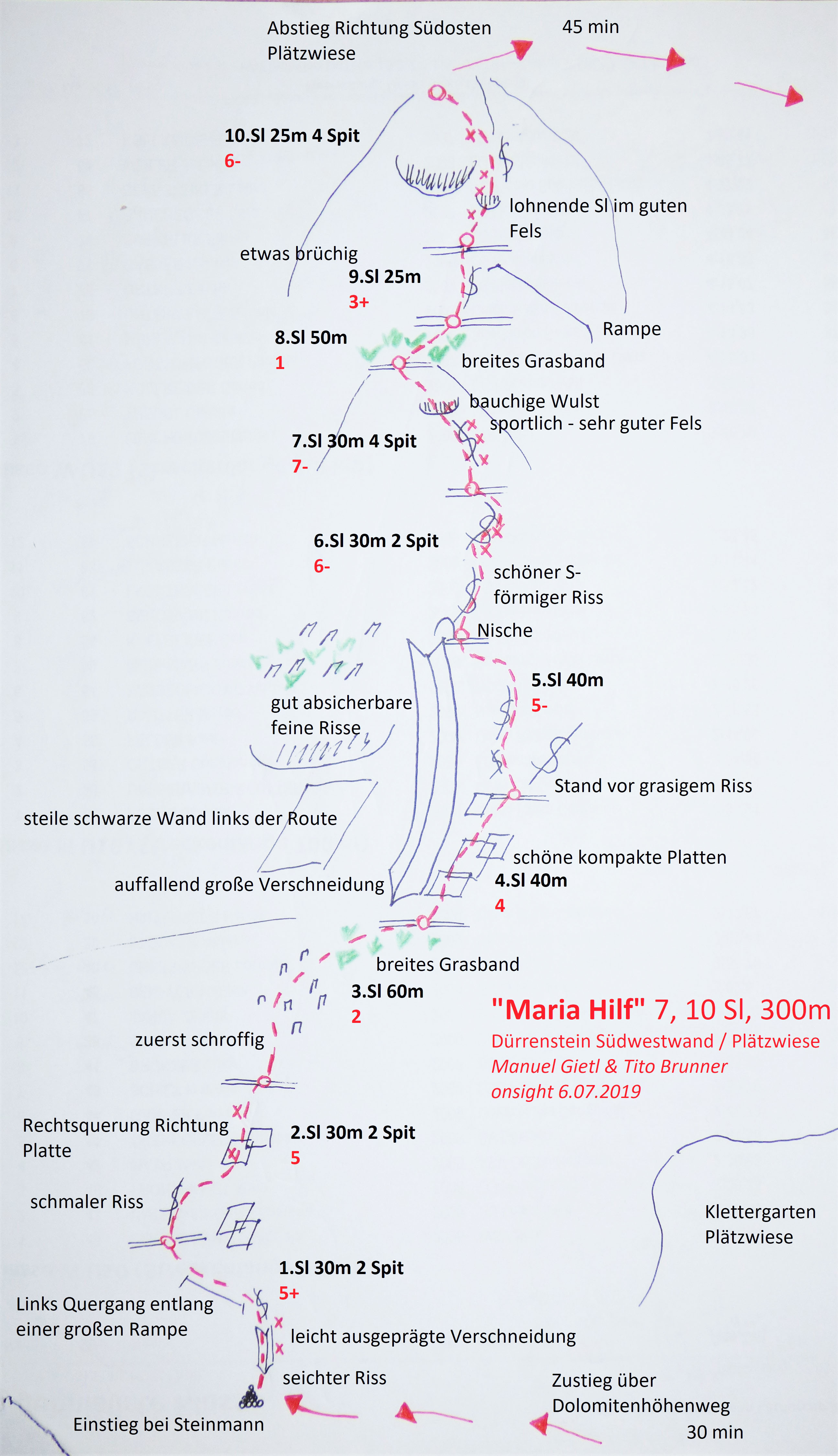 Dürrenstein Südwestwand? Ja die gibt es wirklich. Nachdem ich mit einigen Freunden Ende Juni vom Klettergarten Kirchler im Pragstertal zurück zum Parkplatz Plätzwiese ging, fiel mir auf, dass zwischen dem Klettergarten Plätzwiese und Kirchler noch einiges an unberührten Felsenland vorhanden ist. Auf den ersten Blick zwar wenig spektkulär, aber mit etwas Fantasie und Kreativität bastelte ich mir bereits eine mögliche Linie im kopf zusammen. Wenige Tage vergingen und am darauffolgenden Wochenende stand ich mit Tito Brunner voll motiviert am Einstieg. Der Zustieg gestaltete sich schon sehr unkompliziert. Entlang des Dolomitenhöhenweges geht man zuerst am Klettergarten Plätzwiese vorbei und quert kurz nachher in nördliche Richtung zum Einstieg.