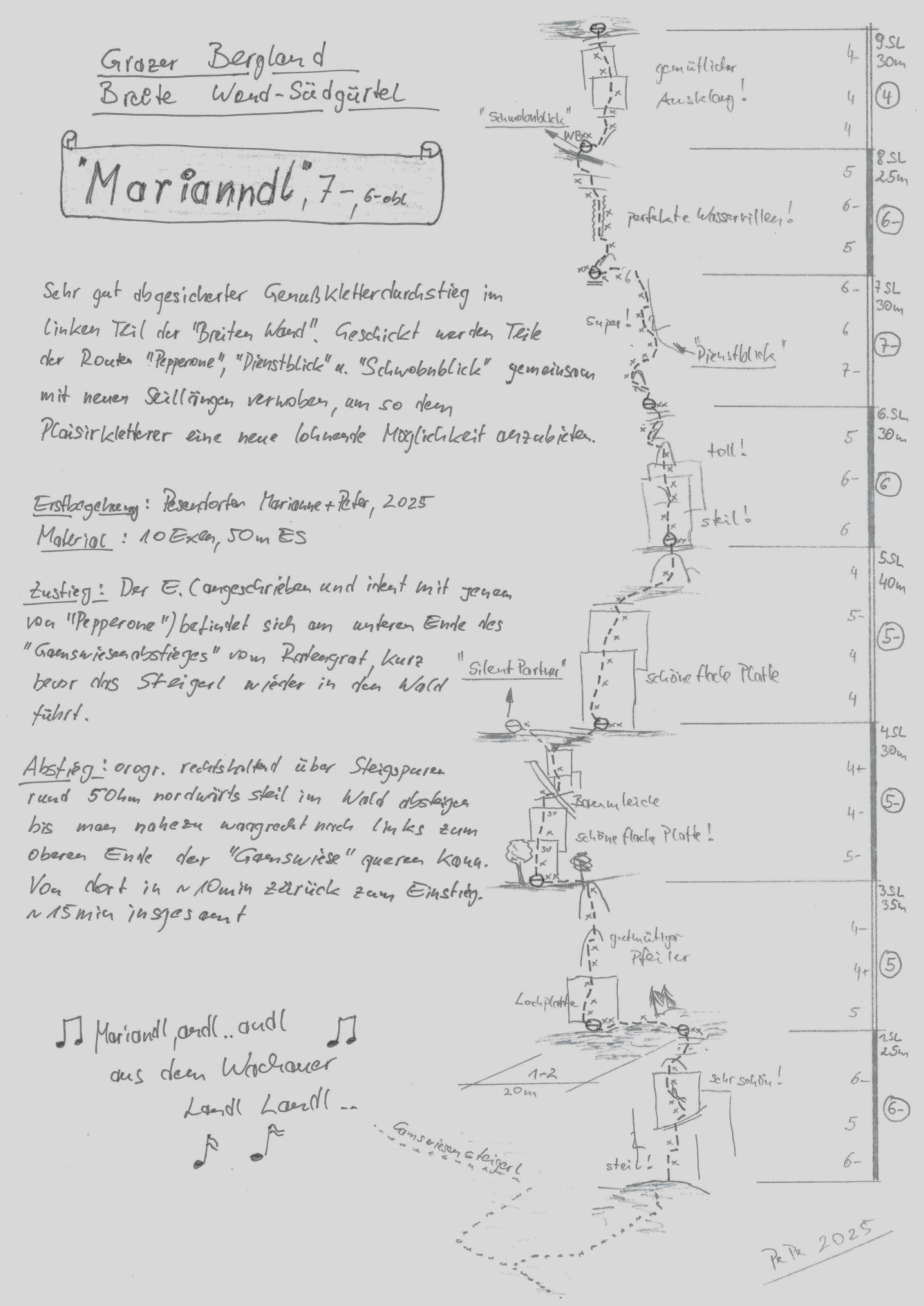 Während man es am Ratengrat mit Don Kamille und Querulanten zu tun hat, warten in der Breiten Wand Pepperone und Marianndl auf kombinatsfähige Genusskletterer. Geschickt werden Teile der Routen „Pepperone (Pesendorfer & Hohensinner 2021), „Dienstblick (Pesendorfer & Ostermayer, 2012“ und „Schwobnblick (Pesendorfer & Zink, 2005) gemeinsam mit neuen Seillängen verwoben, um so dem Plaisirkletterer eine weitere lohnende Möglichkeit anzubieten.