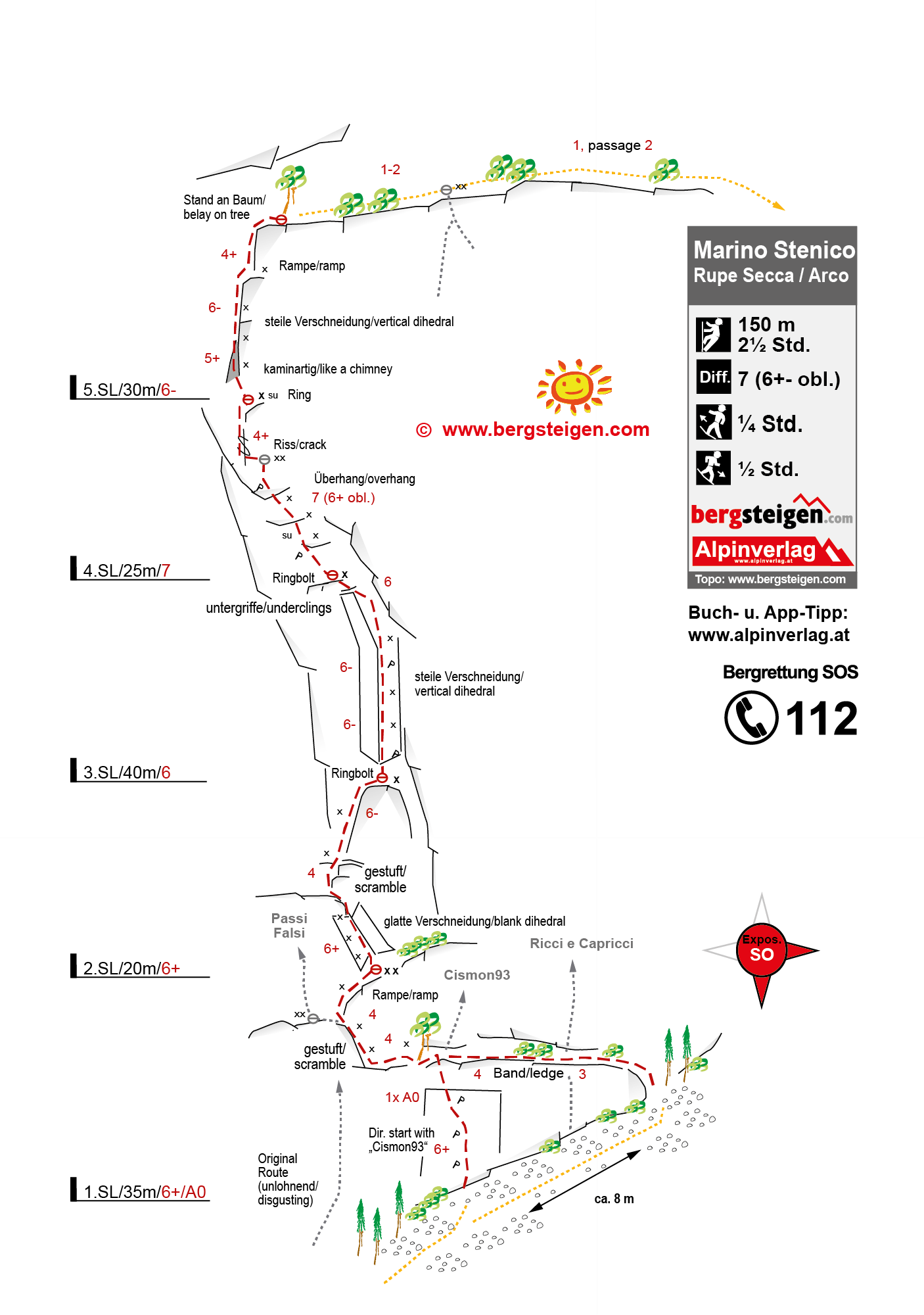 Die Route Marino Stenico ist ein schöner, zu Unrecht etwas selten besuchter Klassiker am Rupe Secca. Die Route bietet athletische Verschneidungskletterei an noch nicht so abgespecktem Fels. Sollte man gemacht haben!