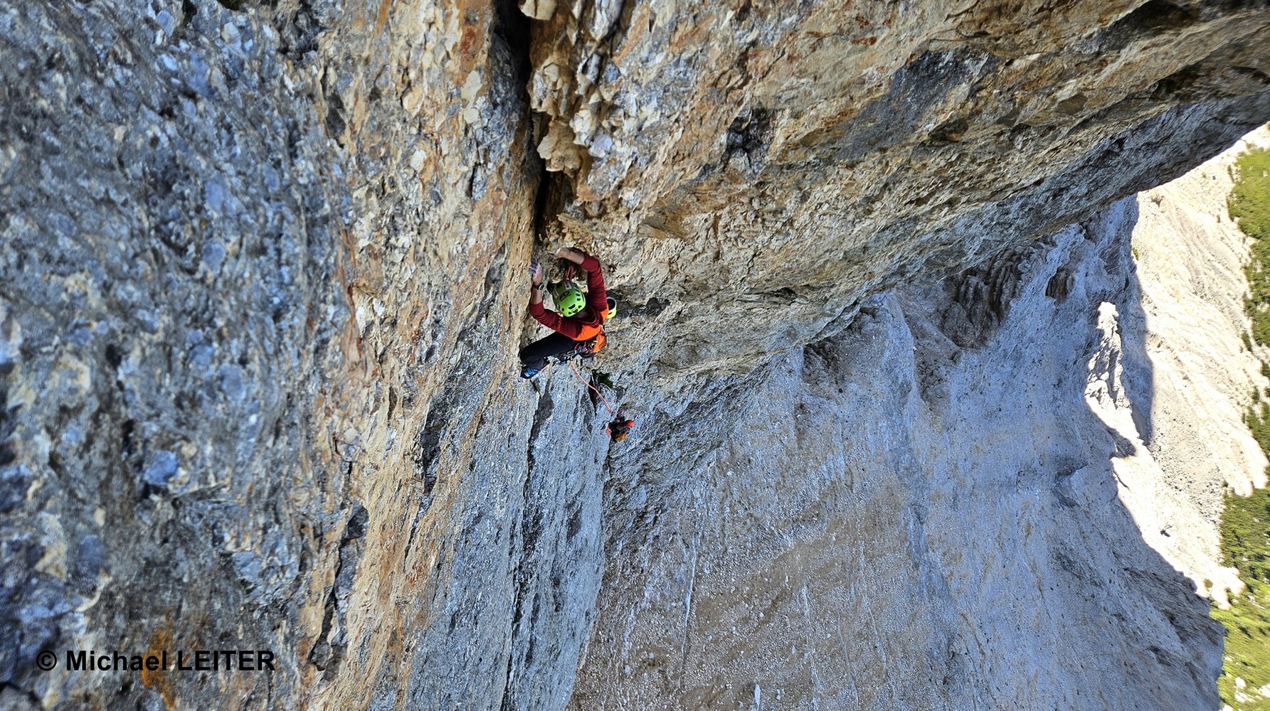 L6-7: Das markante Dach links umgehen, steil weiter entlang eines glatten Risses und final entlang athletischer Schuppen zum Stand in tiefer Nische.