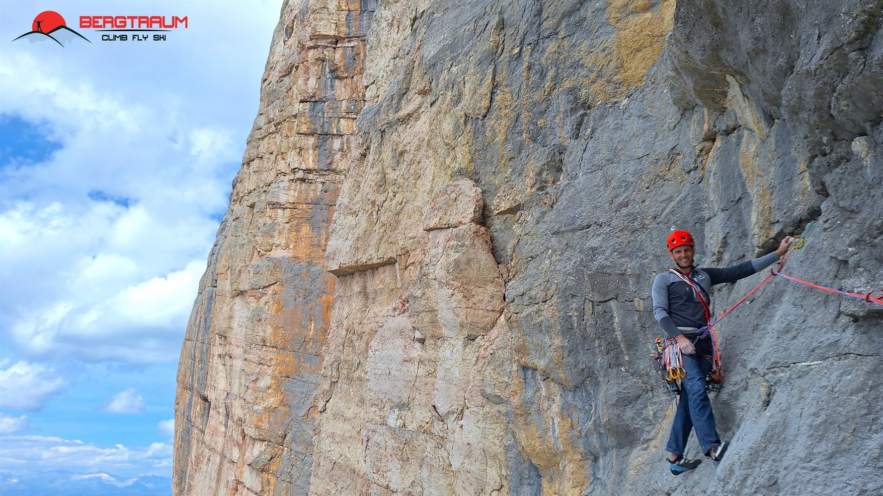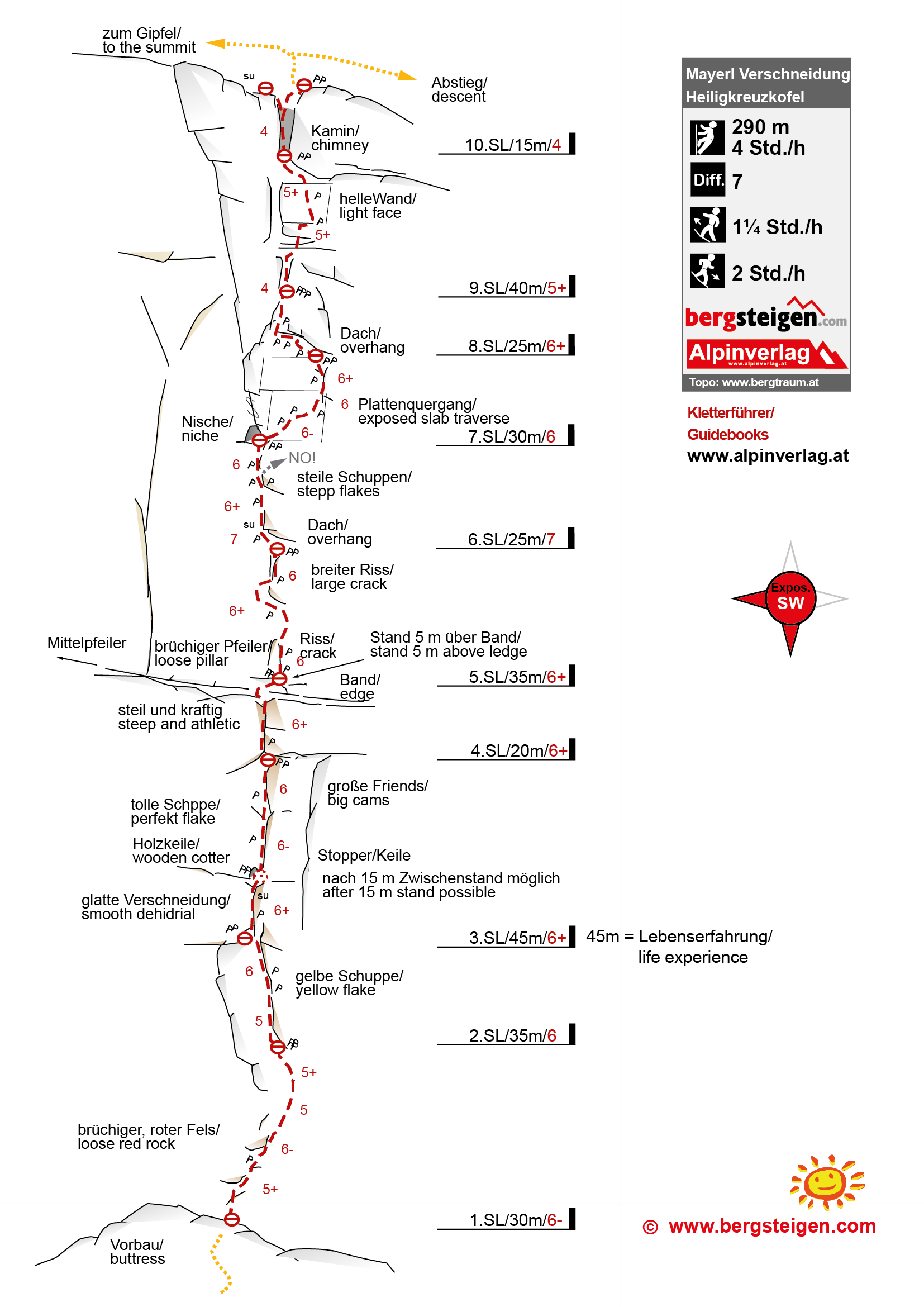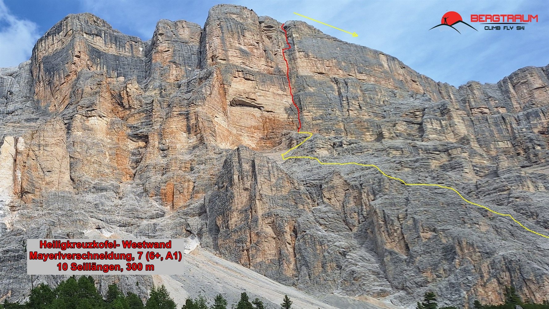 Das Kabinettstück des Osttiroler Kirchturmrestaurator. Extrem eindrückliche Linie im rechten Teil der Westwand. Vorwiegend Verschneidungs- und Risskletterei im typischen Dolomitenfels. Unten brüchig, nach oben hin besser werdend, aber nie zuverlässig. Steil bis überhängend bei vorwiegend selbständig anzubringenden Sicherungen. Rundum ists eine herb, alpine Tour bei der man den Schwierigkeiten mehr als gewachsen sein sollte. So schrieben z.B. die Ulmer Jungs auf Ihren Blog über die dritte und vierte Seillänge: "45m Lebenserfahrung!"