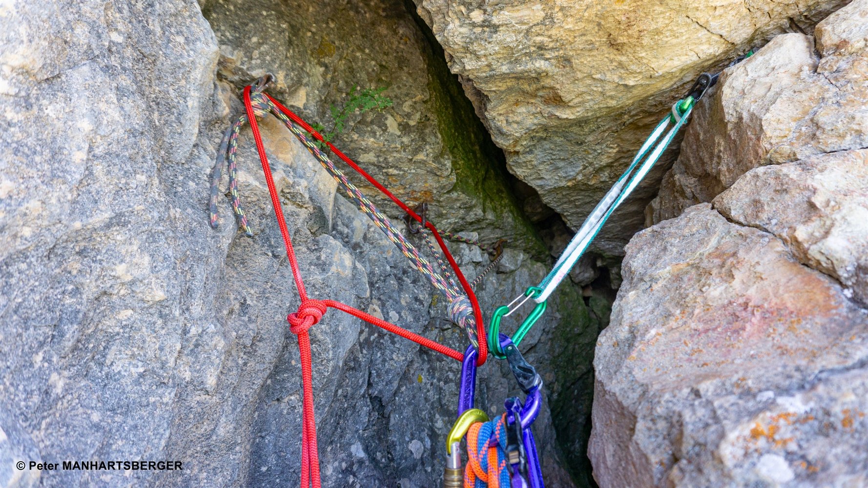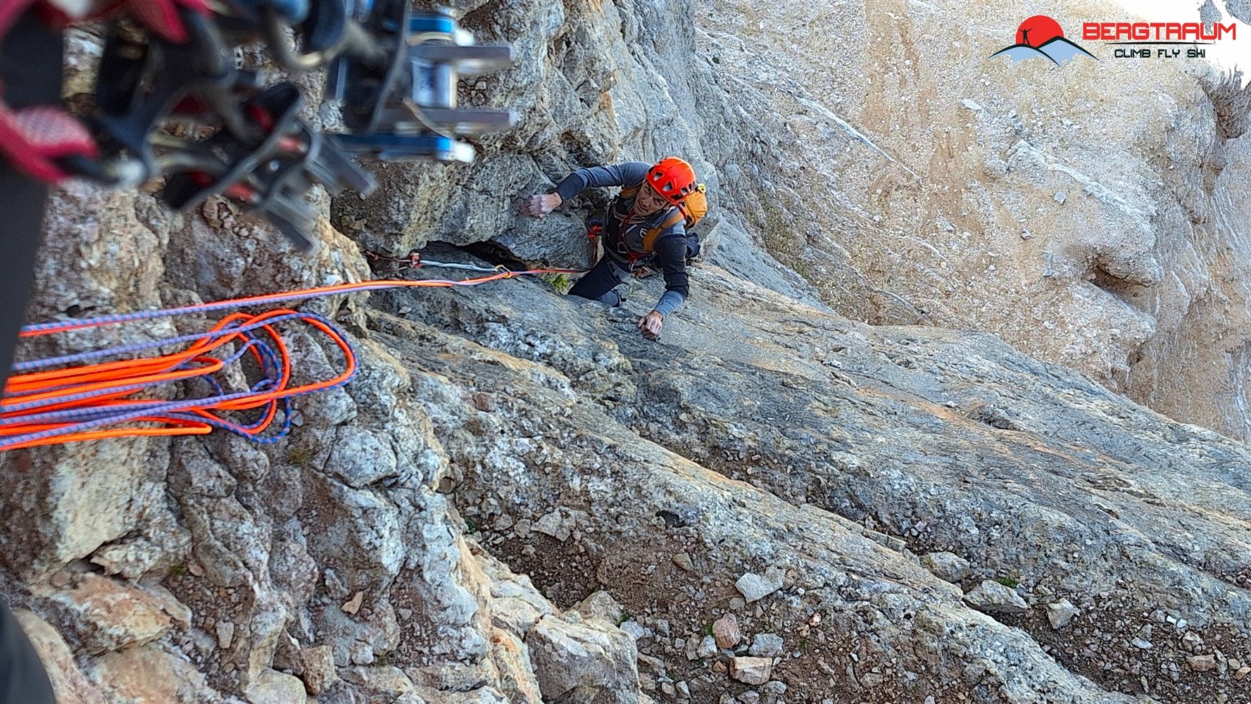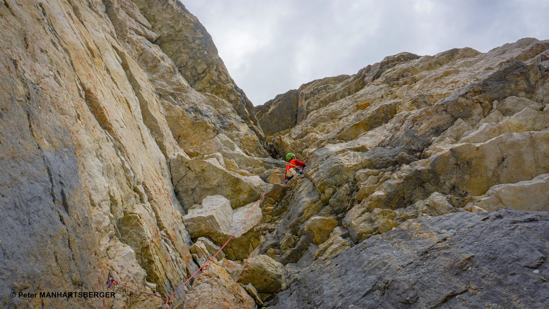 L4- 6+: Über einen kleinen Überhang zum Schrofenband (Abzweigung zur Messner nach links) und zum Standplatz.