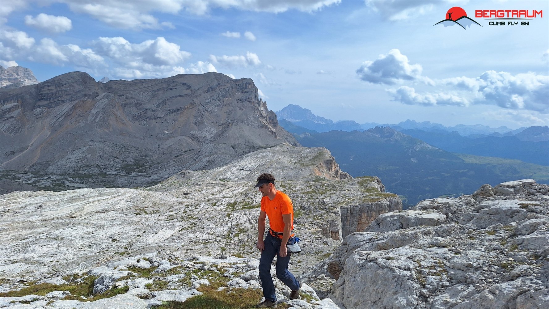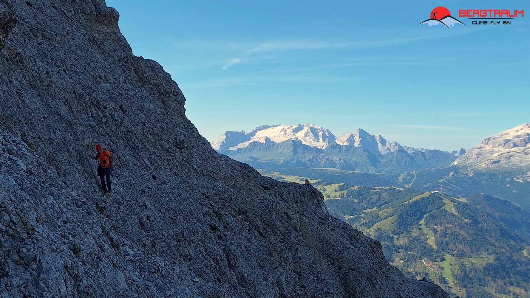 Vom PP unterhalb der Malga Munt Pasciantadu (1.650 m) anfangs der Strasse nach, dann über markierten Wanderweg zur Bergstation beim Heiligkreuzhospiz (2.045 m). Weiter über den Weg Nr. 7 in südlicher Richtung unter der Westwand entlang zwischen den Latschen bis zu markantem Schotterfeld mit Rinne (2.150 m). Über den Schrofenvorbau entlang gut sichtbarer Steinmänner im Zick zack nach oben. Unter einem steilen Aufschwung markant nach links, dann wieder zurück nach rechts und über eine Rinne steil hinauf zum Einstieg (2.580 m).