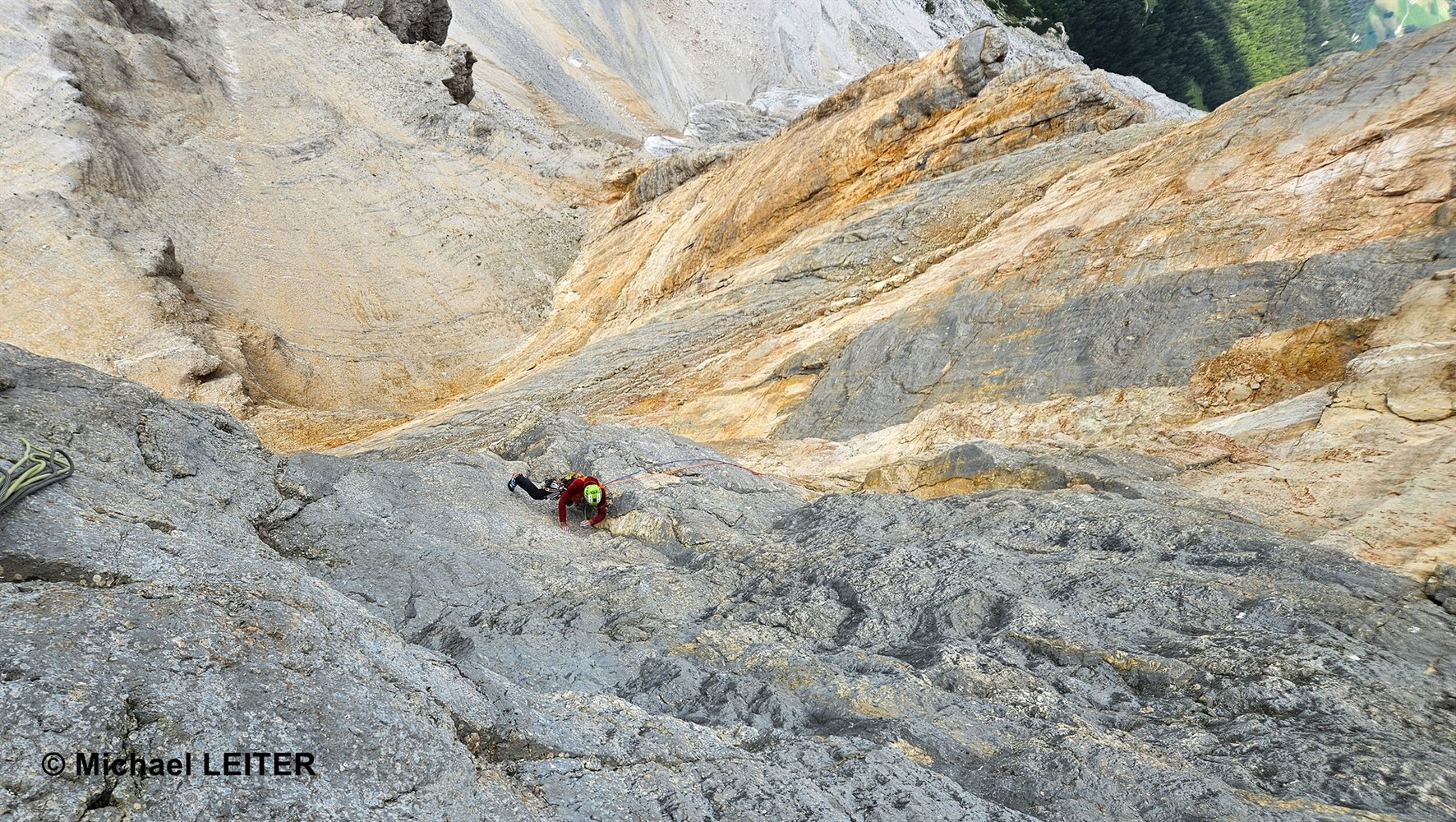 L7- 6: Ausgesetzt ganz markant waagrecht nach rechts, dann weiter leicht ansteigend queren über eine steile Platte bis zu einer Verschneidung und dieser senkrecht hinauf folgen bis zum Stand.