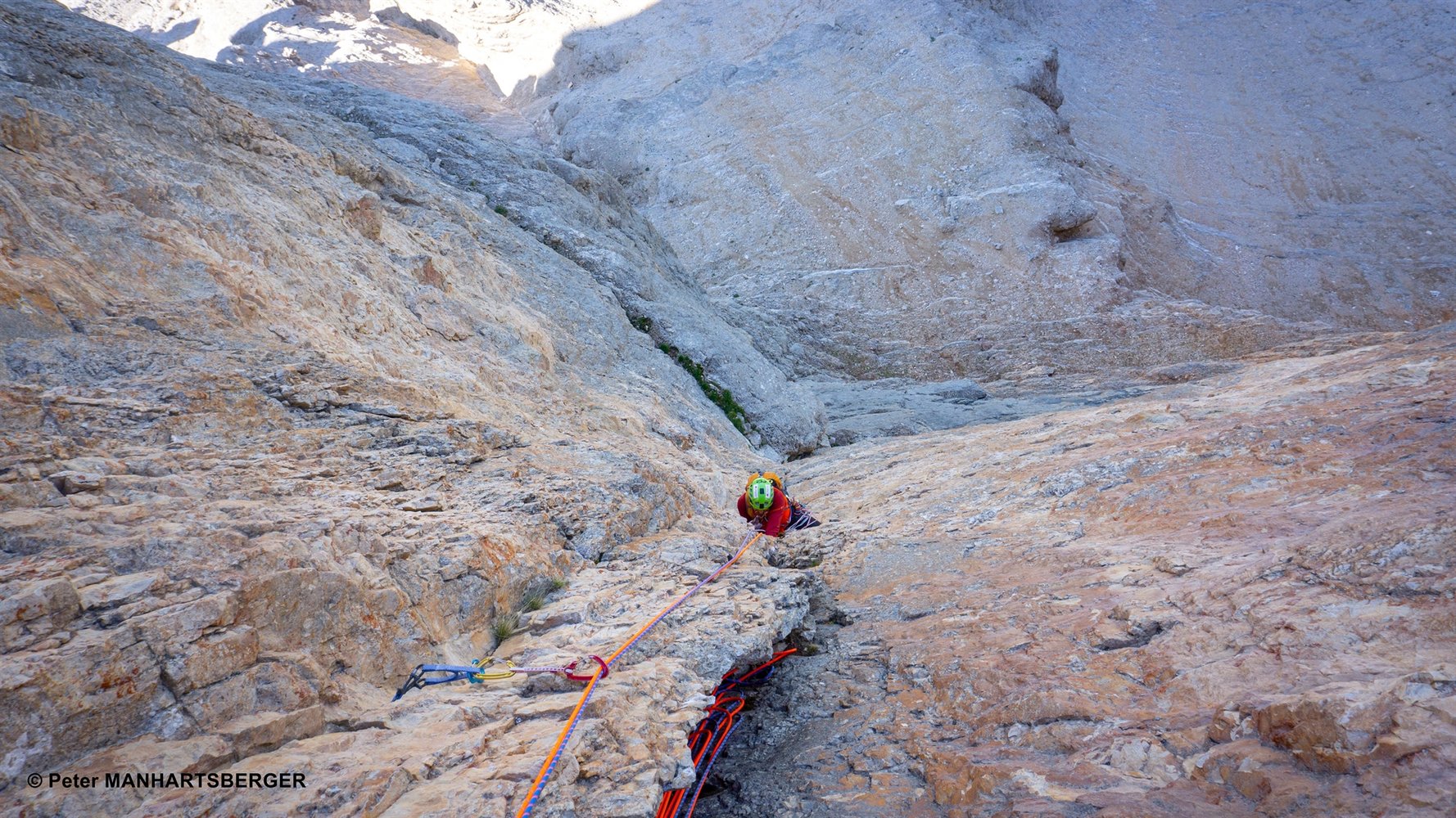 L8- 6+: Unter einem Dach markant schräg links aufwärts und weiter leicht rechts hinauf in leichterem Gelände zum Standplatz.
