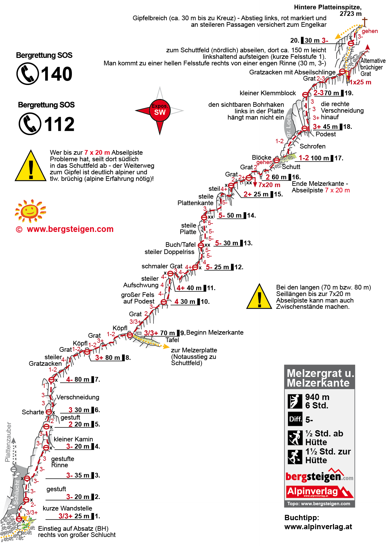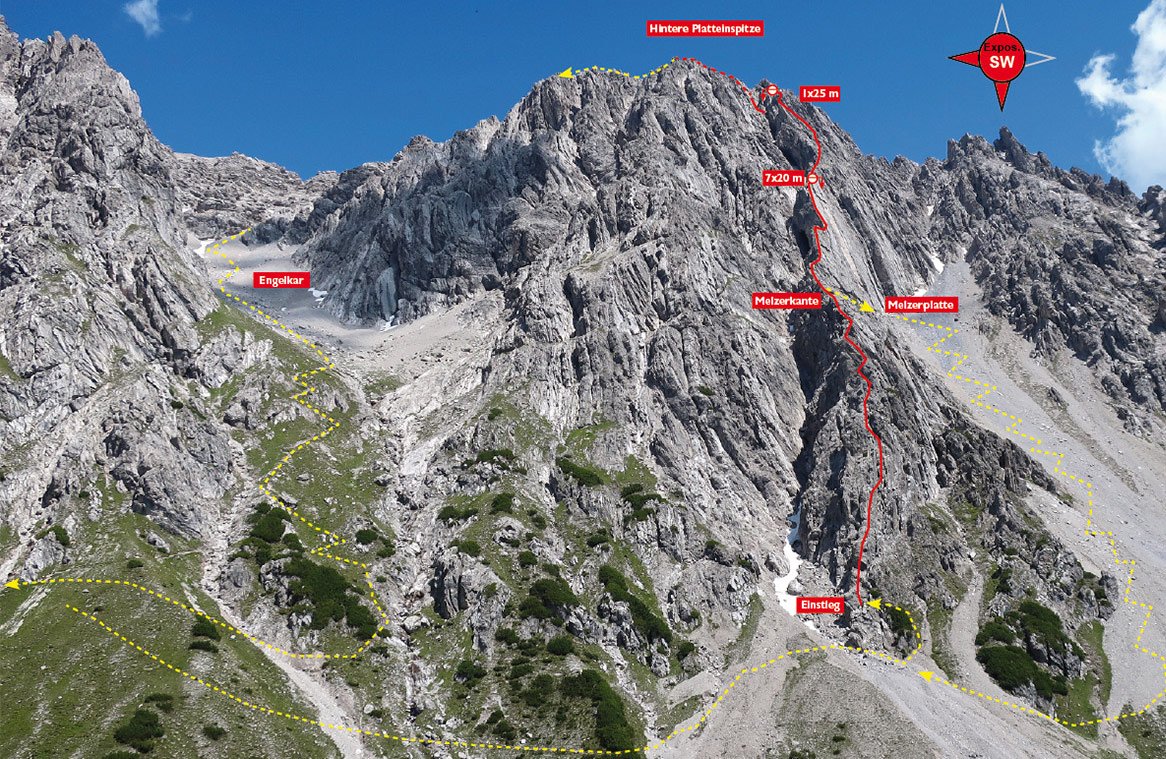 Großartige, sehr lange Gratkletterei an der Hinteren Platteinspitze. Vor allem im Mittelteil klettert man sehr luftig und steil direkt an einer fantastischen Gratrippe. Diese lange Grattour hat – wegen der spärlichen und bis dato recht ungenauen Topoinformation – relativ wenig Bekanntheitsgrad, obwohl das Potential zum langen Gratklassiker durchaus vorhanden ist. Wer eine lange, schöne, mittelschwere und ab dem Mittelteil wirklich aufregende Gratkletterei sucht, ist am Melzergrat genau richtig!