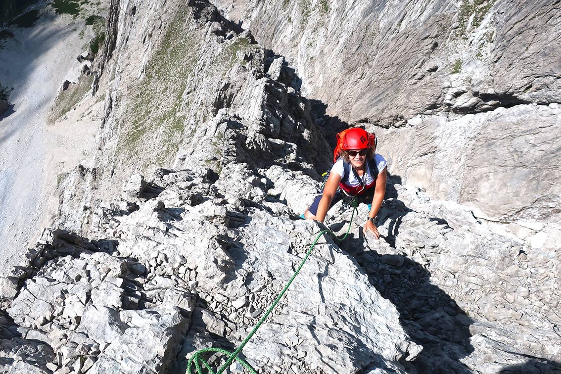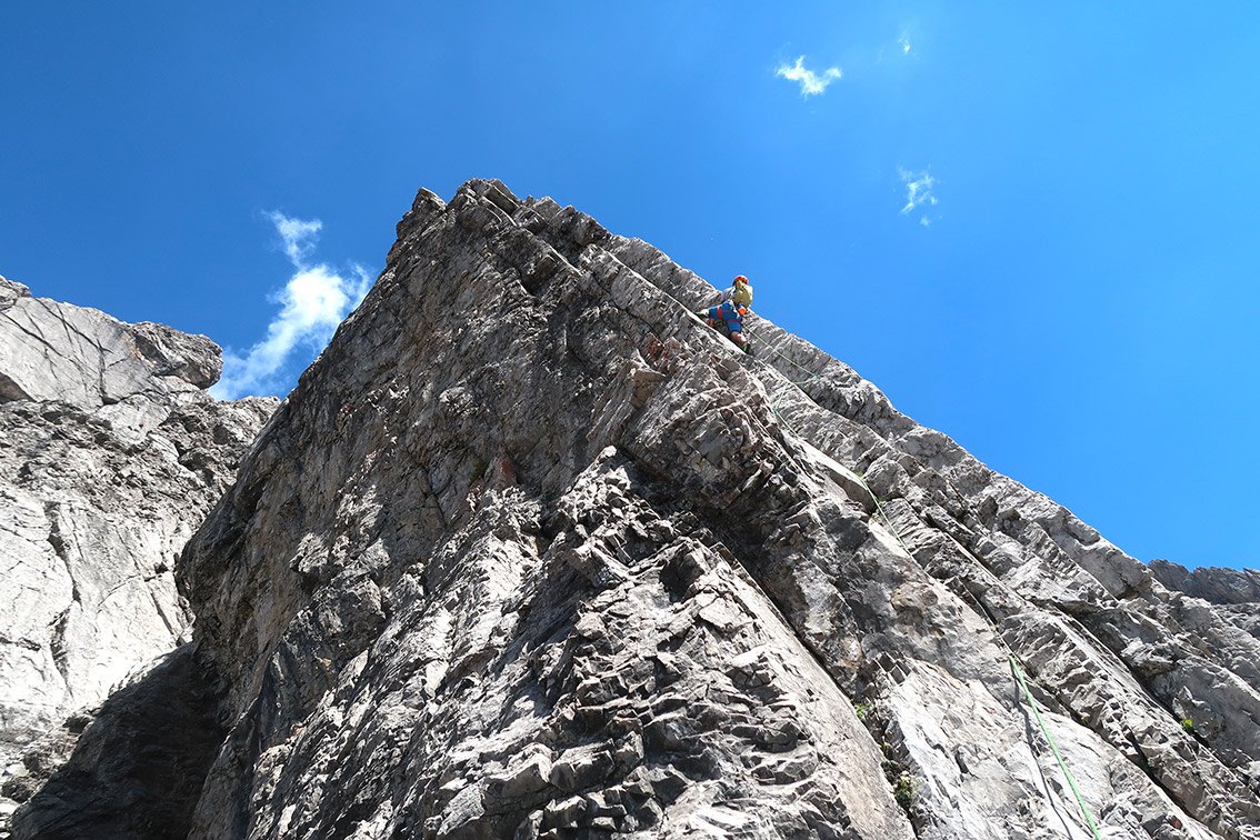 Kletterzeit haben wir mit 6 Stunden angegeben - wer Passagen seilfrei oder am laufenden Seil klettert, ist naturgemäß schneller. Wer sich im 2-3er Grad nicht zügig bewegt, braucht aber vermutlich länger (8-9 Stunden) bis zum Gipfel.