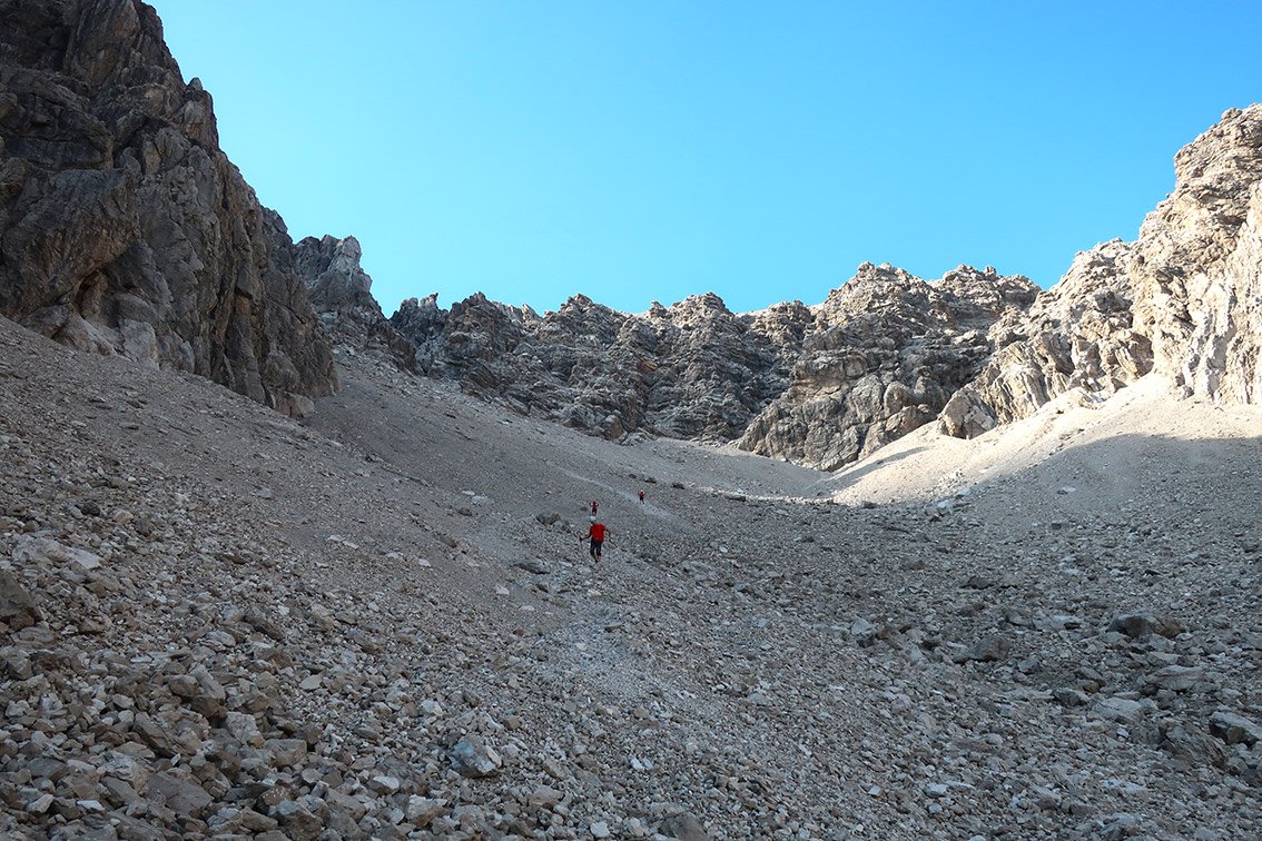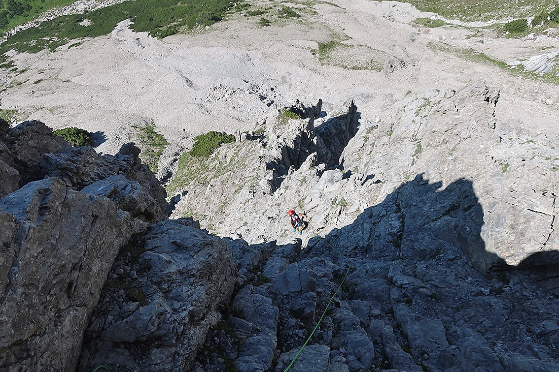 Alternativer Abstieg ist die 7x20 m Abseilpiste. Man erreicht das Schuttkar und steigt in diesem hinunter zum Zustiegsweg und auf diesem erreicht man wieder die Hütte.