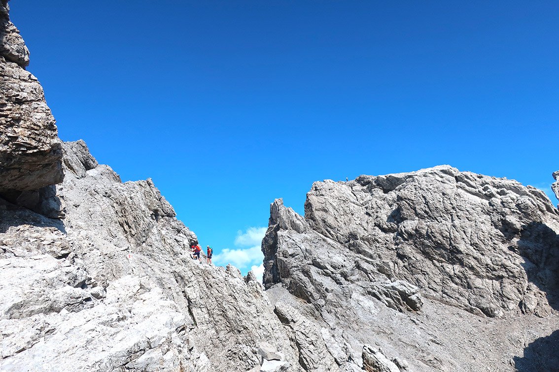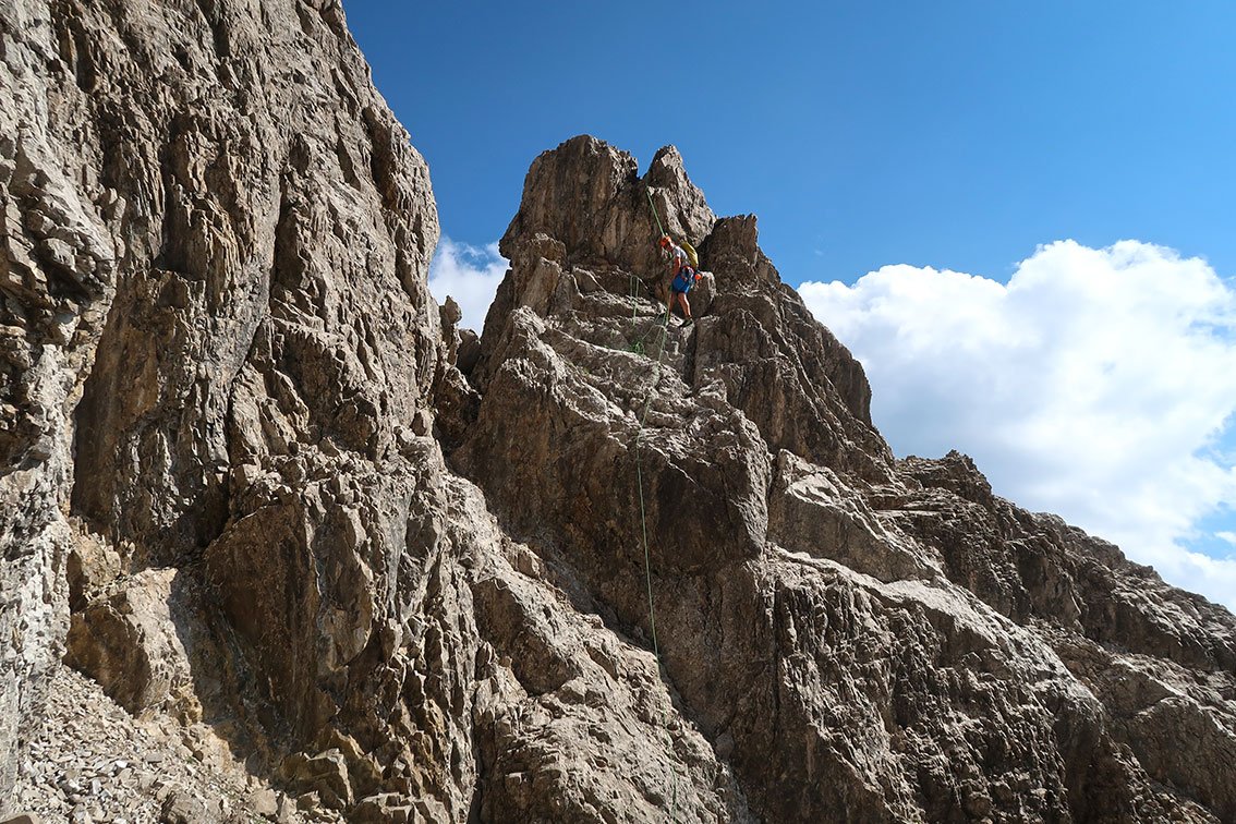 Siehe Topo. Ab der 7 x 20 m Abseilpiste wird die Gratroute deutlich alpiner. Wir – und vermutlich viele andere – haben von einem Gratzacken (siehe Topo - Abseilschlingen mit Karabiner) in das Schuttfeld 1 x 25 m abgeseilt (die folgenden zwei kurzen, etwas brüchigen Gratzacken können natürlich auch noch direkt überklettert werden). Im Schuttfeld steigt man etwas auf, über eine kurze leichte, helle Felsstufe gelangt man ansteigend links haltend wieder in Schutt. Auf diesem bis in eine markante, enger werdende Rinne aufsteigen. Dort rechts, an anfangs heller Felsstufe ca. 30 m im unteren 3ten Grad aufwärts, man erreicht das Flachstück vor dem Gipfel und schlussendlich das Gipfelkreuz.