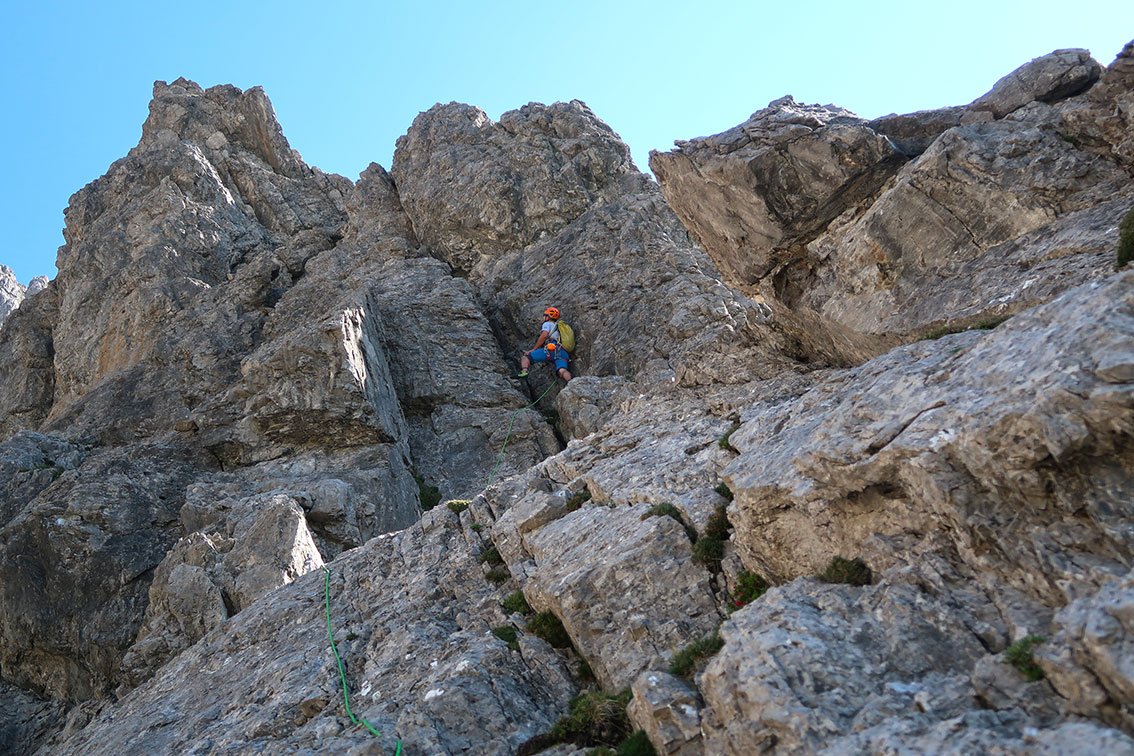 Der obere Teil - ab der 7 x 20 m Abseilpiste - ist alpin und verlangt etwas Spürsinn für die richtige Routenführung. In der letzten 3+ Verschneidung sieht man die Bohrhaken nicht sofort, links, ganz oben steckt ein Bohrhaken in einer Platte. Man klettert aber die Verschneidung ganz rechts hinauf (2 Bohrhaken, Standmöglichkeit danach an kleinem Klemmblock).