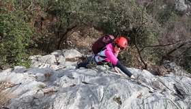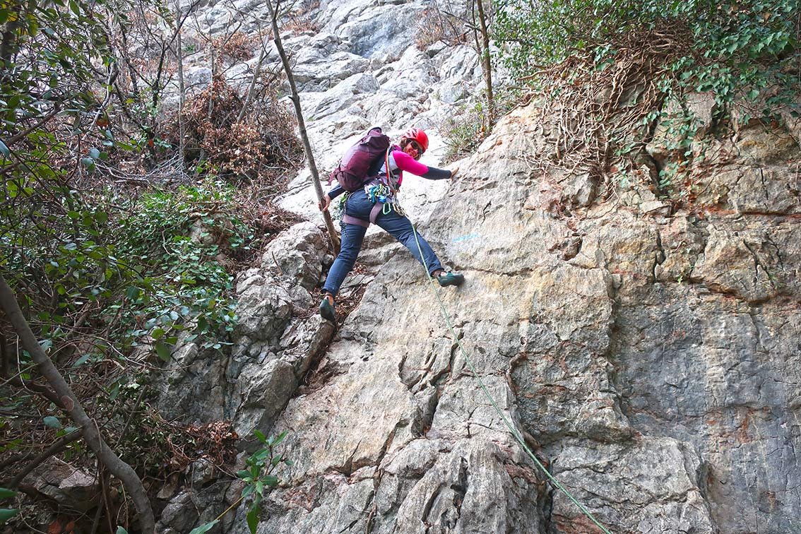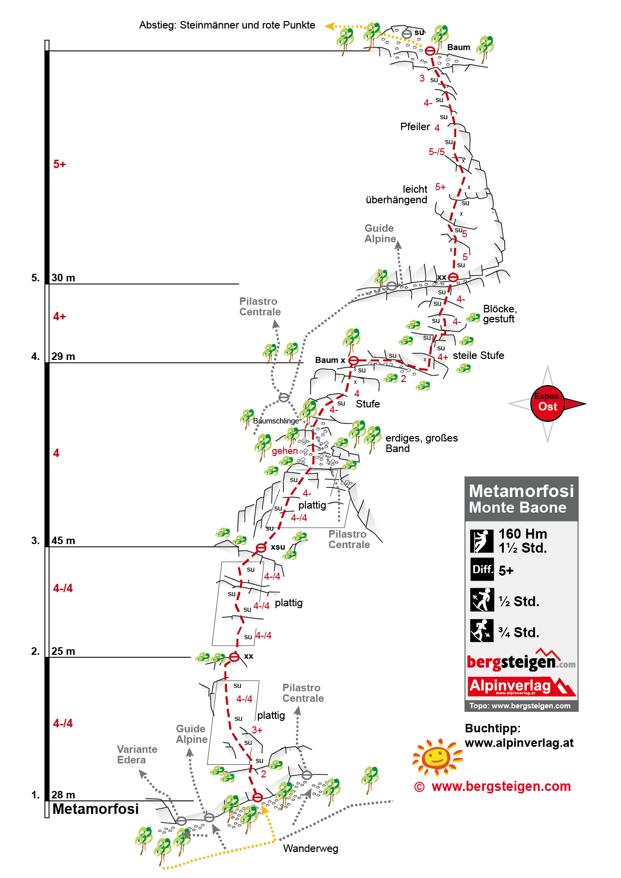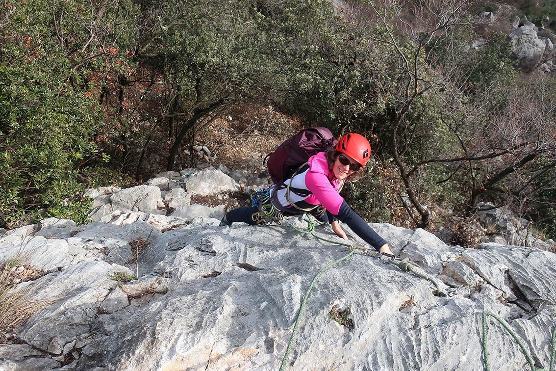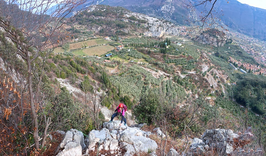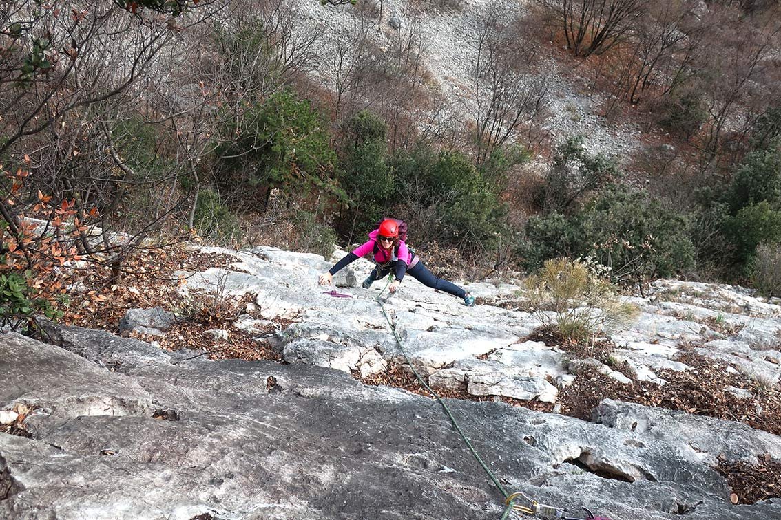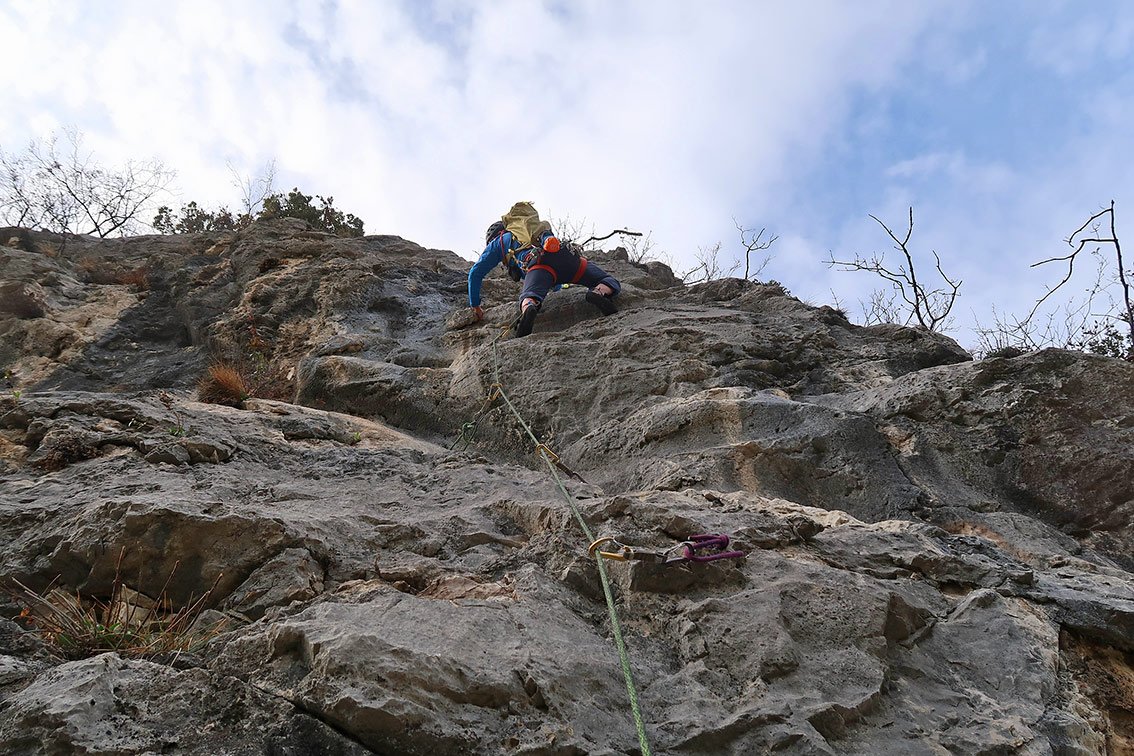 Die Metamorfosi am Monte Baone ist ein Spiegelbild der Route Guide Alpine - unten leichte, gestufte Platten und oben dann ein etwas schwerer Ausstieg. Die Route wurde mit sehr viel Aufwand (im Mittelteil wurde ein kleiner Buschwald entfernt - Greta Thunberg lässt grüßen) angelegt. Im gesamten eine sehr gute und lohnende Tour, mit einer wirklich schönen, sehr steilen und ausgesetzten Ausstiegsseillänge. Wegen der niedrigen Schwierigkeit, dem einfachen Zu- und Abstieg und dem schönen Ambiente oberhalb von Arco hat dieser Anstieg das Rüstzeug zum perfekten Genuss-Klassiker.