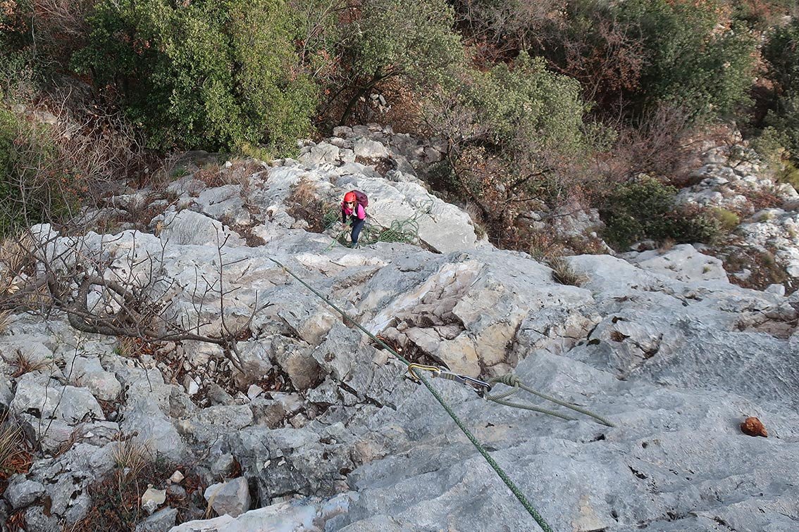 Tipp: Man steigt etwas entlang der Felskante ab (blasse Markierung), dann muss man eine leichte Felsstufe in eine Art Rinne abklettern (auf der anderen Rinnenseite ist ein Felspfeiler, dort ist der Ausstieg der Via Edera), dann die Rinne, welche zur originellen Schlucht wird, südlich absteigen (zwei kurze Stufen müssen abgeklettert werden, ca. 1+; bei Nässe heikel). Unten, am Ende der Schlucht, dann rechts wieder zum weiteren Abstiegsweg. Siehe dazu Übersichtsbild.