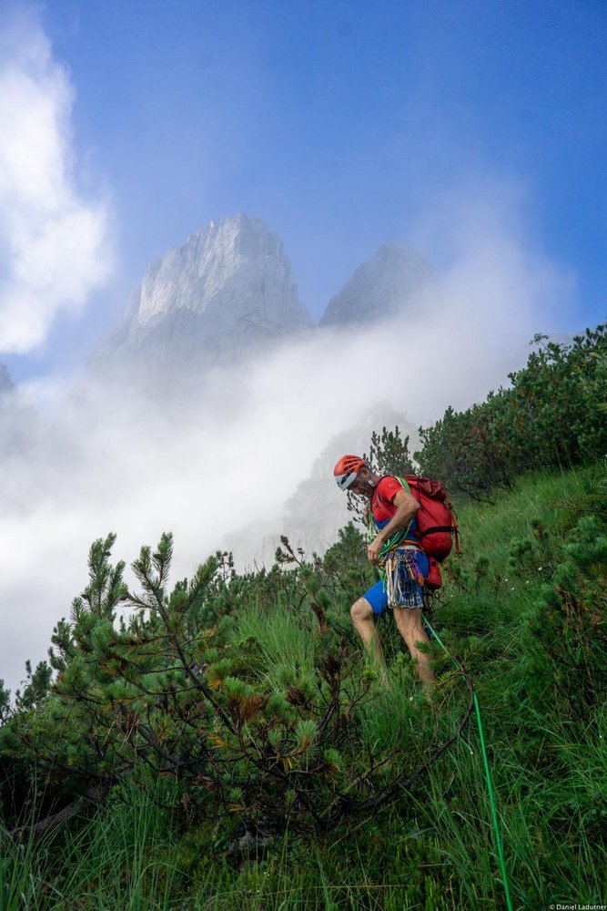 60 m Doppelseil, 10 Express (inkl. lange), Cams bis 3, Helm, Tiblocs für das gleichzeitige Klettern und Biwakausrüstung