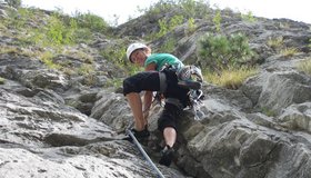 1 x 50 m Einfachseil, 10 Expressschlingen und unbedingt Helm.