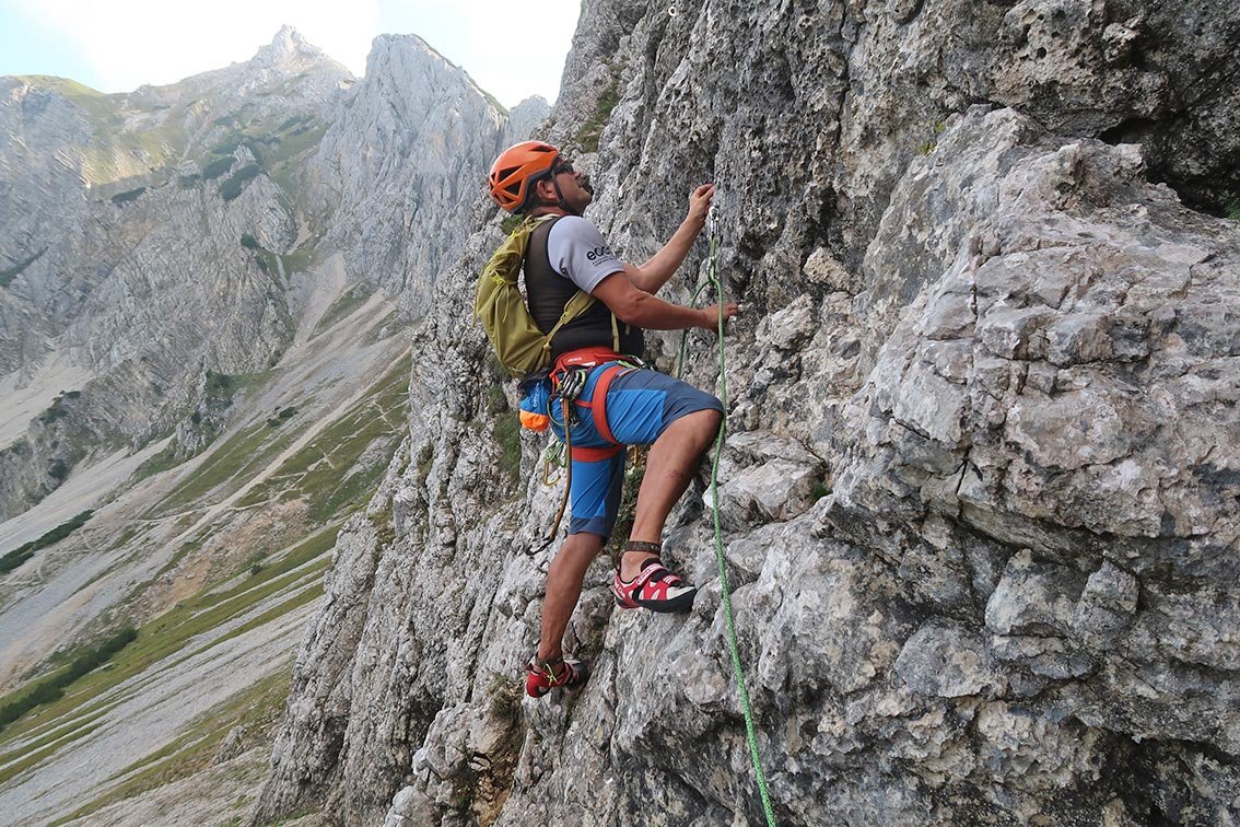 „Muggi, das waren noch Zeiten“ umfasst eine steile, im Mittelteil sehr gute Wandkletterei. Dieser Wandbereich wurde vom Erstbegeher sehr solide und üppig mit Bohrhaken ausgestattet. Man schafft die Tour nach oben, auch wenn es im unteren Sektor feucht ist und man keine Vorliebe für 7+ Plattenpassagen hat. Bis auf die Schlüsselstelle und die Ausstiegsseillänge eine schöne, griffige und raue Kletterei in einer ruhigeren Ecke des Tannheimer Tales.