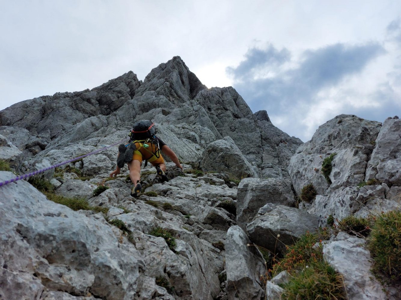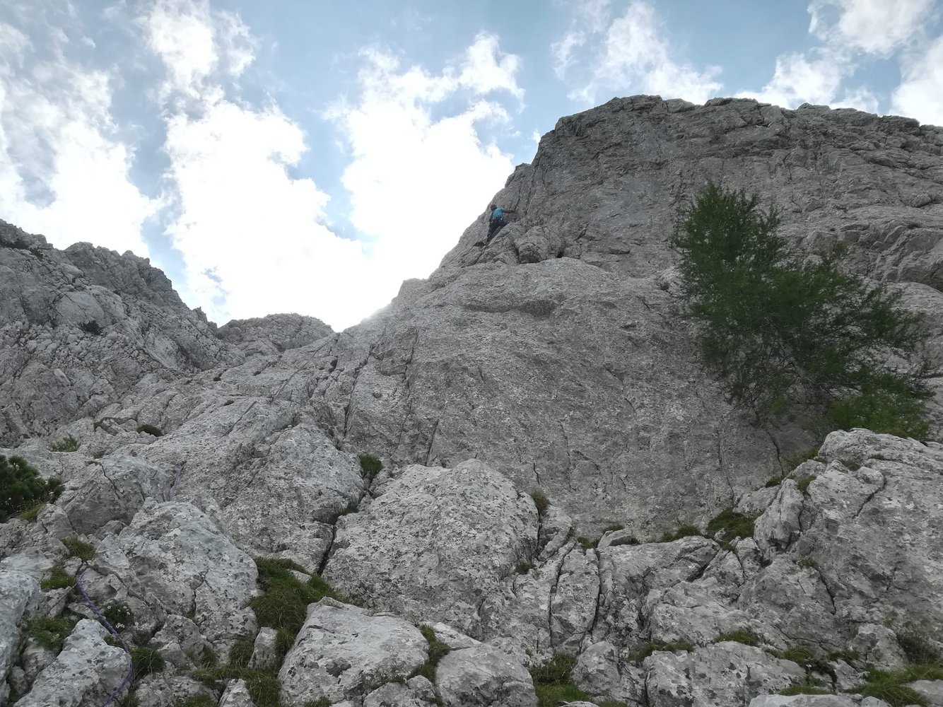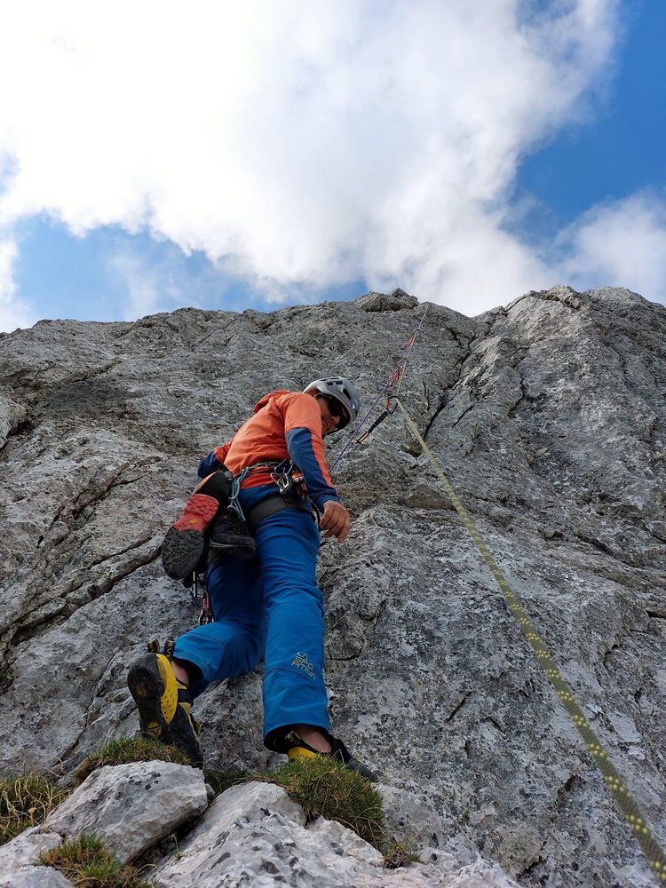 2.SL: 5m hoch, dann rechts vorbei am Block mit BH (Gehgelände) und weiter gerade hoch über Schrofen. In der schrofigen Verschneidung leicht nach links, dann rechts auf die kurze Rampe unter Wandl zu Stand. Beim Abseilen unbedingt als Abseil-Erster den Bohrhaken beim markanten Block einhängen (Exe) und das Seilende im Stand unterhalb fixieren (Der „erprobte“ Pendelsturz war nicht lustig.).