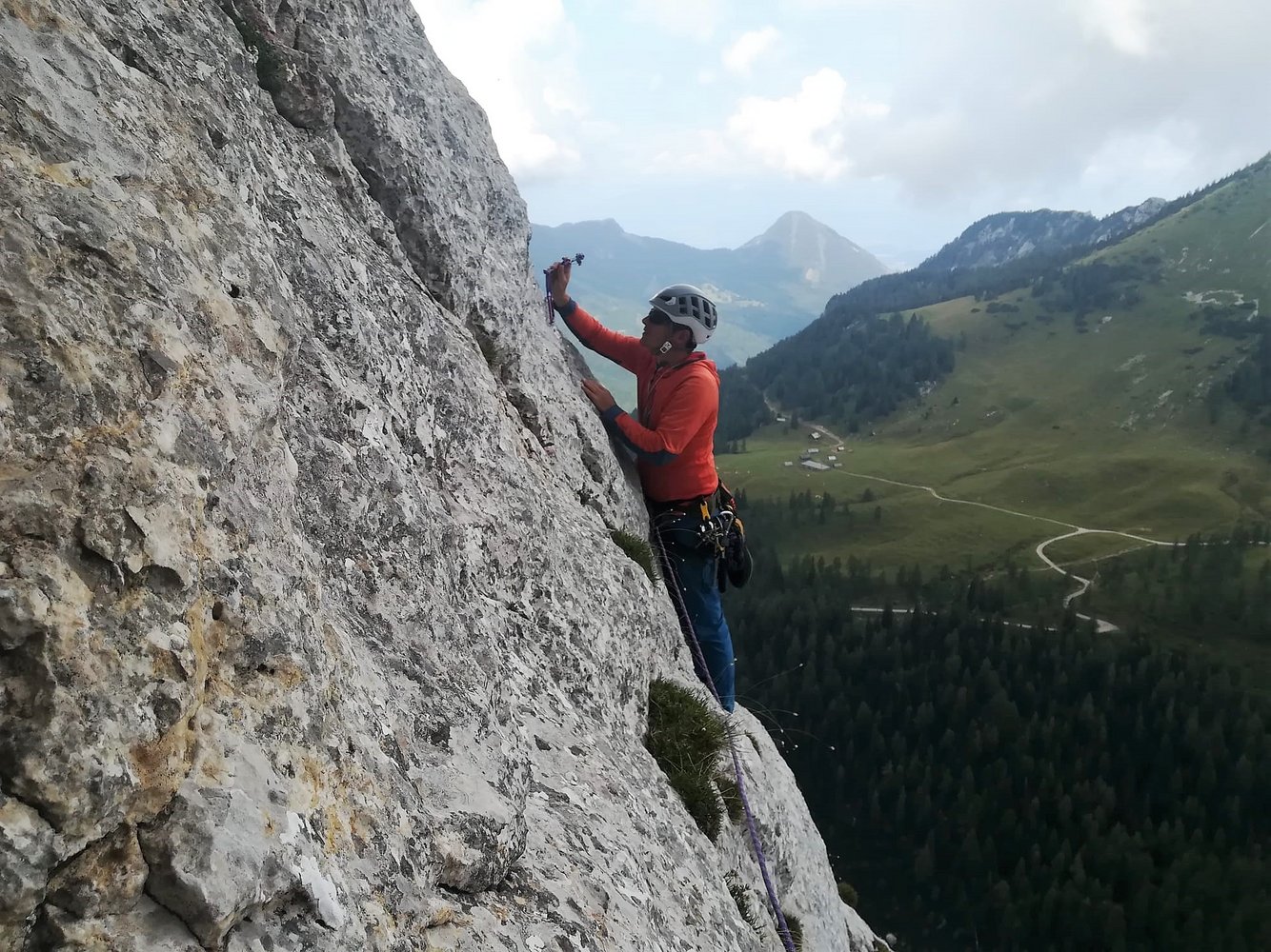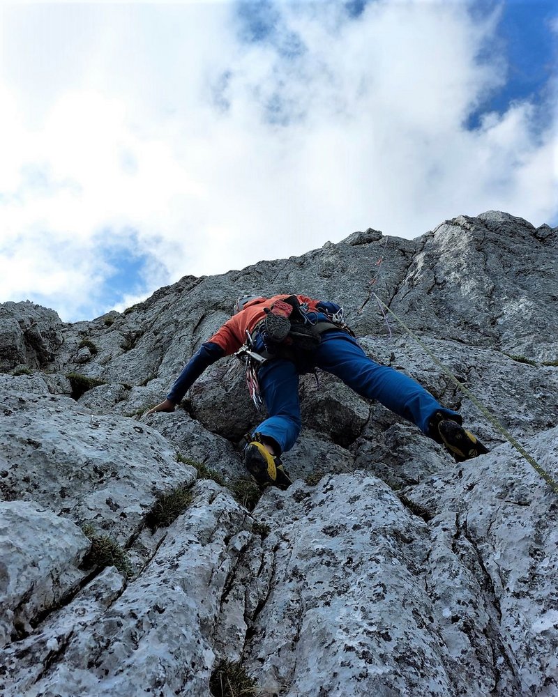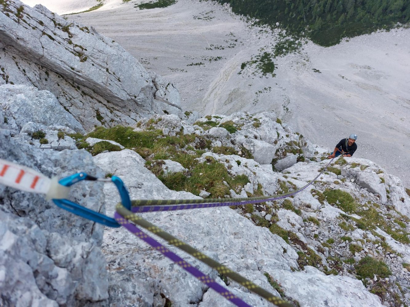 2.SL: 5m hoch, dann rechts vorbei am Block mit BH (Gehgelände) und weiter gerade hoch über Schrofen. In der schrofigen Verschneidung leicht nach links, dann rechts auf die kurze Rampe unter Wandl zu Stand. Beim Abseilen unbedingt als Abseil-Erster den Bohrhaken beim markanten Block einhängen (Exe) und das Seilende im Stand unterhalb fixieren (Der „erprobte“ Pendelsturz war nicht lustig.).