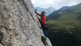 6.SL: ca. 5m entlang der Verschneidung bis Bohrhaken (Verlängern!!), danach scharf nach links bis zur Kante (ausgesetzt, 2.Bohrhaken verlängern), dort hoch und die Wand (6/5A0) bis auf den luftigen Panoramastand (gesamte Route einsehbar).