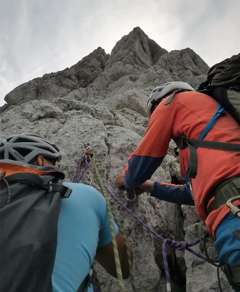 Alle 3 schwierigen Stellen können auch A0 im Schwierigkeitsgrad UIAA V geklettert werden. Dieser Grad sollte allerdings sicher beherrscht werden. Die Stände wurden möglichst sicher vor Steinschlag eingerichtet und sind Kettenstände. Der brüchige Karawankenfels ist nur in der 2.SL zu finden, ansonsten ist die Tour, alpines Grundverständnis vorausgesetzt, in überraschend gutem Fels. Die Routenführung ist derart gewählt, dass eine Gefährdung anderer Seilschaften (auch Kaminreihe) minimiert ist. Alle BH sind gut sichtbar, das Orientieren sollte problemlos sein. Ein Tipp für mutige Kletterer, die gute Absicherung mit alpinem Erlebnis kombiniert haben wollen.