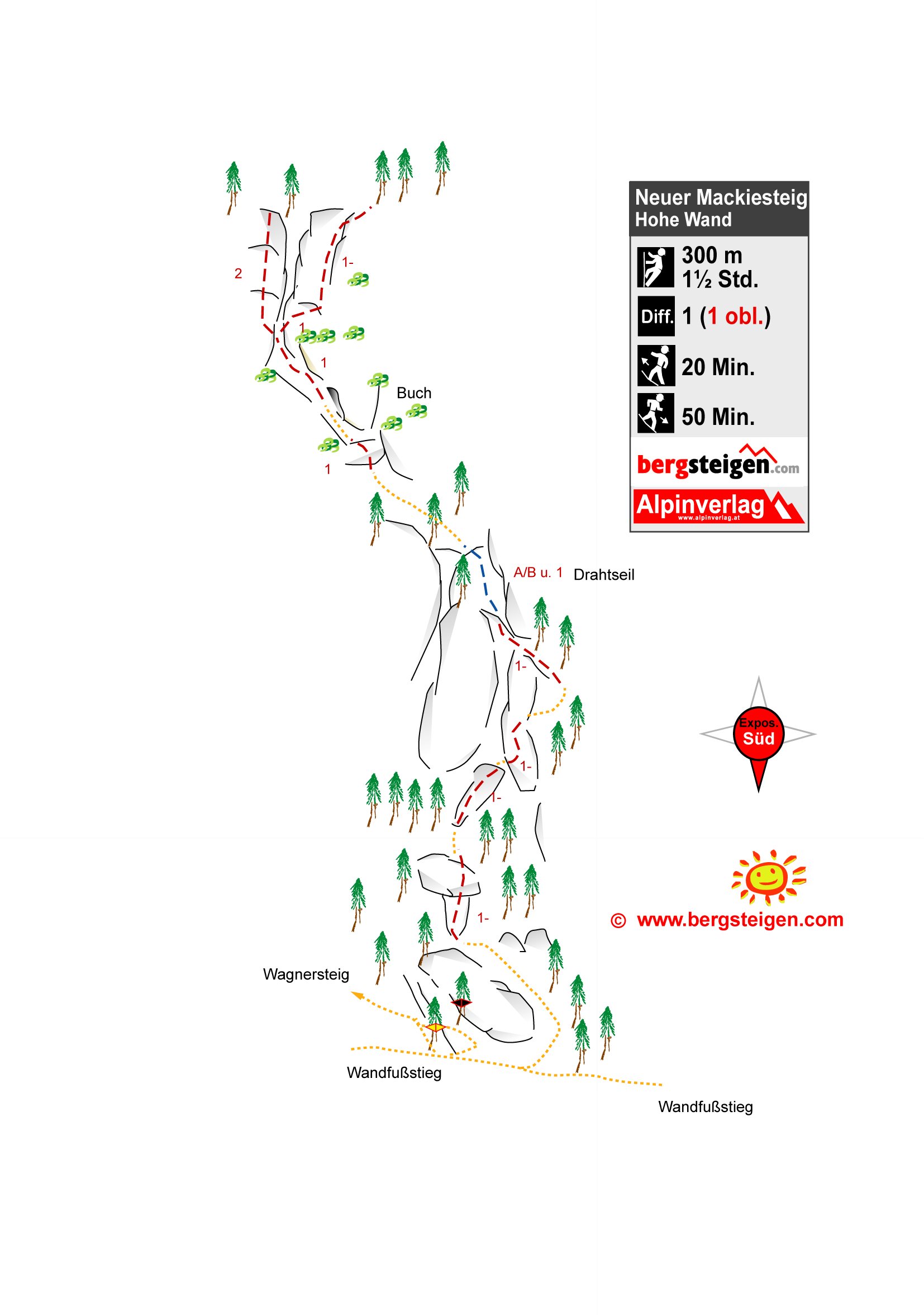 Vom Seiser Toni kurz die Straße entlang und danach zum Wandfußsteig aufsteigen. Nach der Kreuzung mit dem gelb markierten Wagnersteig befindet sich die Tafel des Einstieges. Alternative: bis Oberhöflein und den gelben Markierungen des Wagnersteiges folgen bis zum Wandfußsteig. Dann diesem noch ein paar Schritte nach rechts folgen und blauen Punkten folgend zum Einsteig. (rote Aufschrift).
