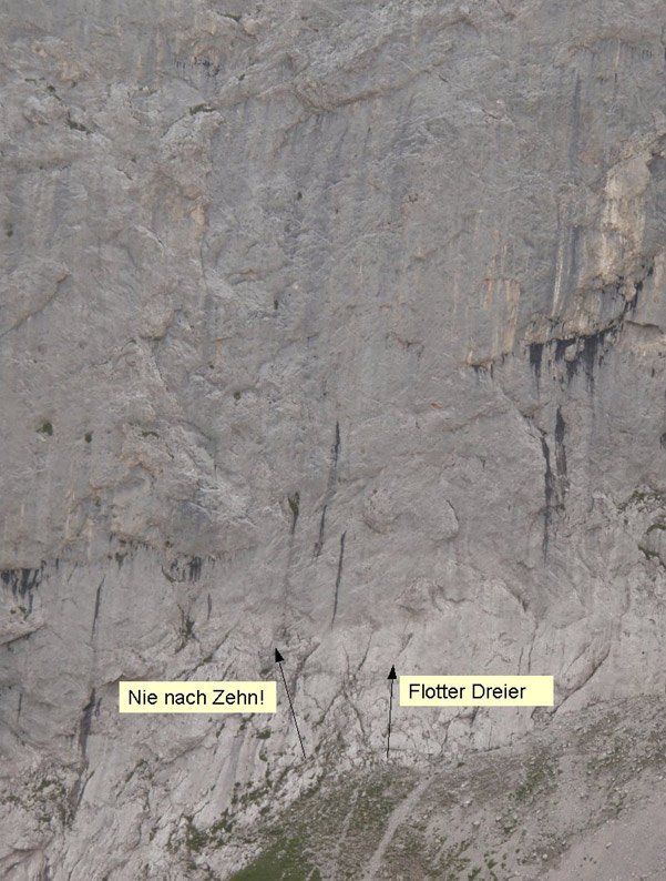 Aus dem Grabenkar erkennt man im unteren, linken Wandteil eine Folge von leichten Senken und flachen Verschneidungen, eingerahmt von großen, kompakten Wandbereichen links und rechts davon. Diesem Verlauf folgt die Route. Die erste SL zieht nach links, der erste Haken befindet sich in etwa 7 m Höhe nach dem leichten Einstieg. Achtung: Ca. 10 m rechts ist der Einstieg der "Flotter Dreier".