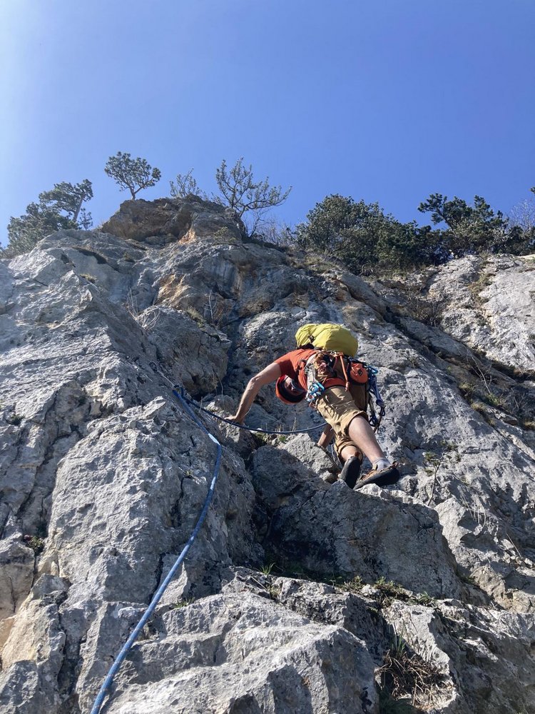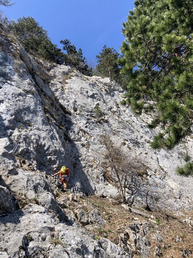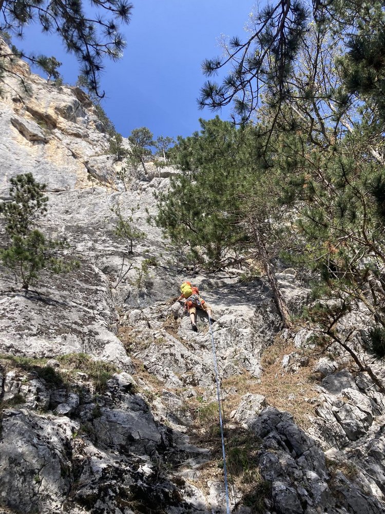 Die Schlüsselstelle in der 4. SL ist mit einem neuen 3 Meter Fixseil entschärft (4+ u. A0), damit auch Freunde des Wienersteigs sie problemlos mit 4+ A0 klettern können. Auch in der 2. SL hängt eine lange Hilfsschlinge.