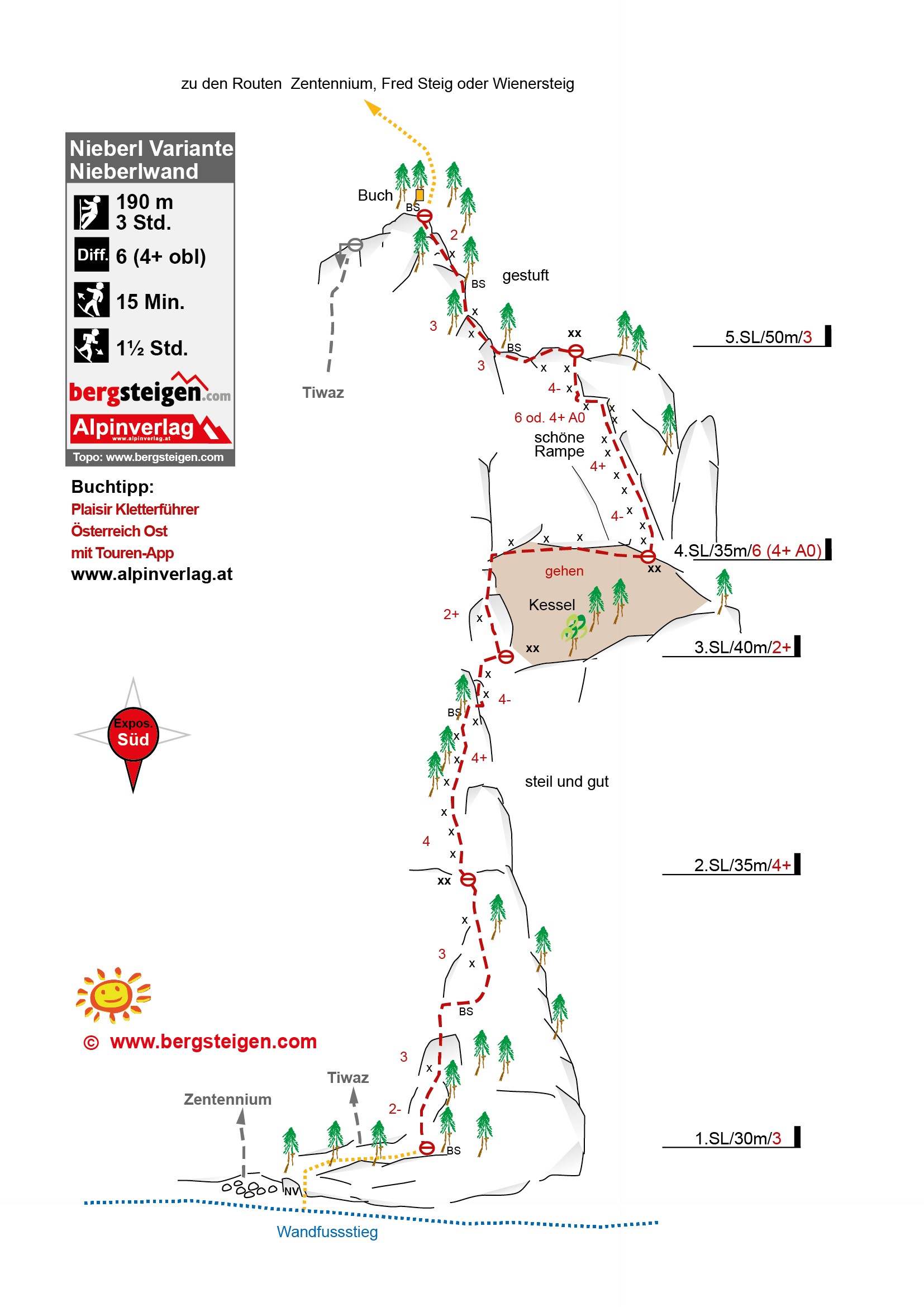 Nette Route im rechten Teil der Nieberlwand, die in Teilen dem alten, in Vergessenheit geratenen Nieberlsteig folgt. Abwechslungsreiche, gut gesicherte Kletterei, die sich als "Einstiegs"variante zu den Routen Zentennium, Fred Steig oder Wienersteig anbietet.