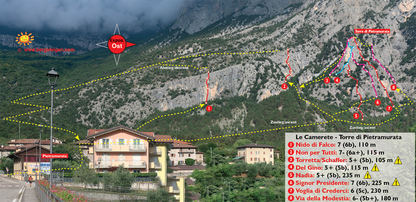 Die Route Non per Tutti oberhalb von Pietramurata ist eine perfekt abgesicherte und abwechslungsreiche Sportkletterei, die sich sehr gut als Halbtagesbeschäftigung eignet. Der Zustieg ist zwar etwas mühsam, die Kletterei dafür aber sehr schön. Wegen der sehr guten Absicherung gut als Einstieg in das Mehrseillängenklettern geeignet - schöner Ausblick auf Pietramurata und den Cavadinesee.