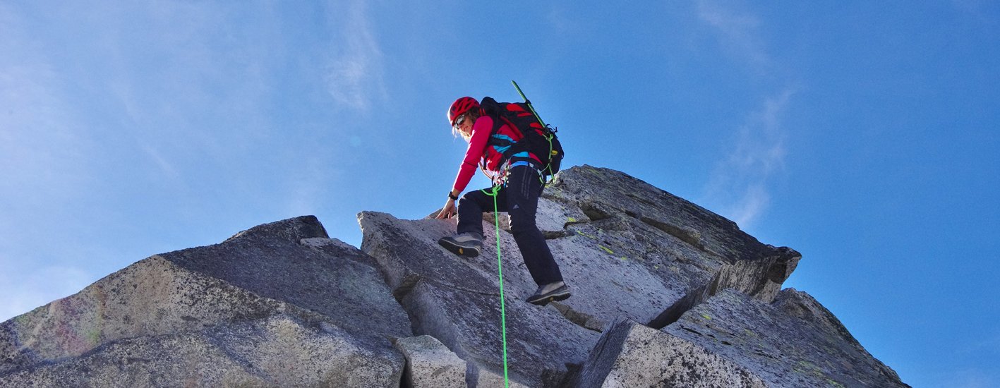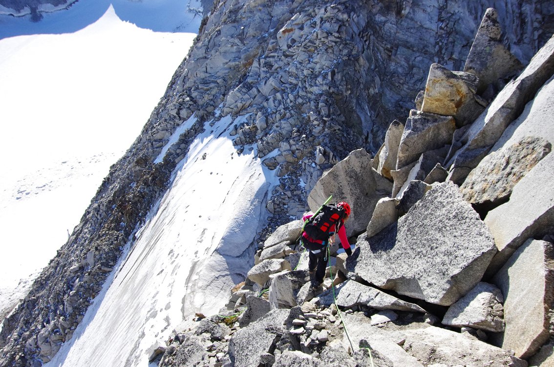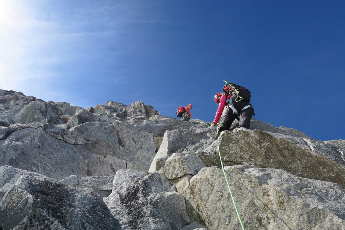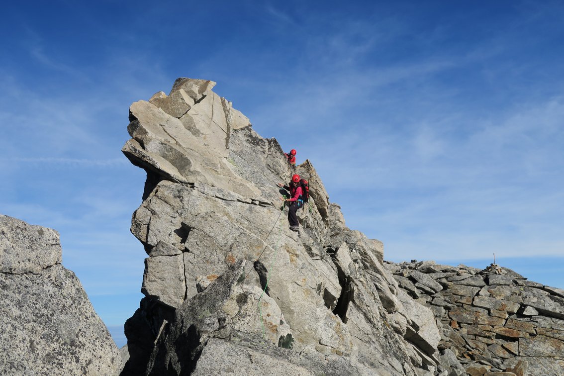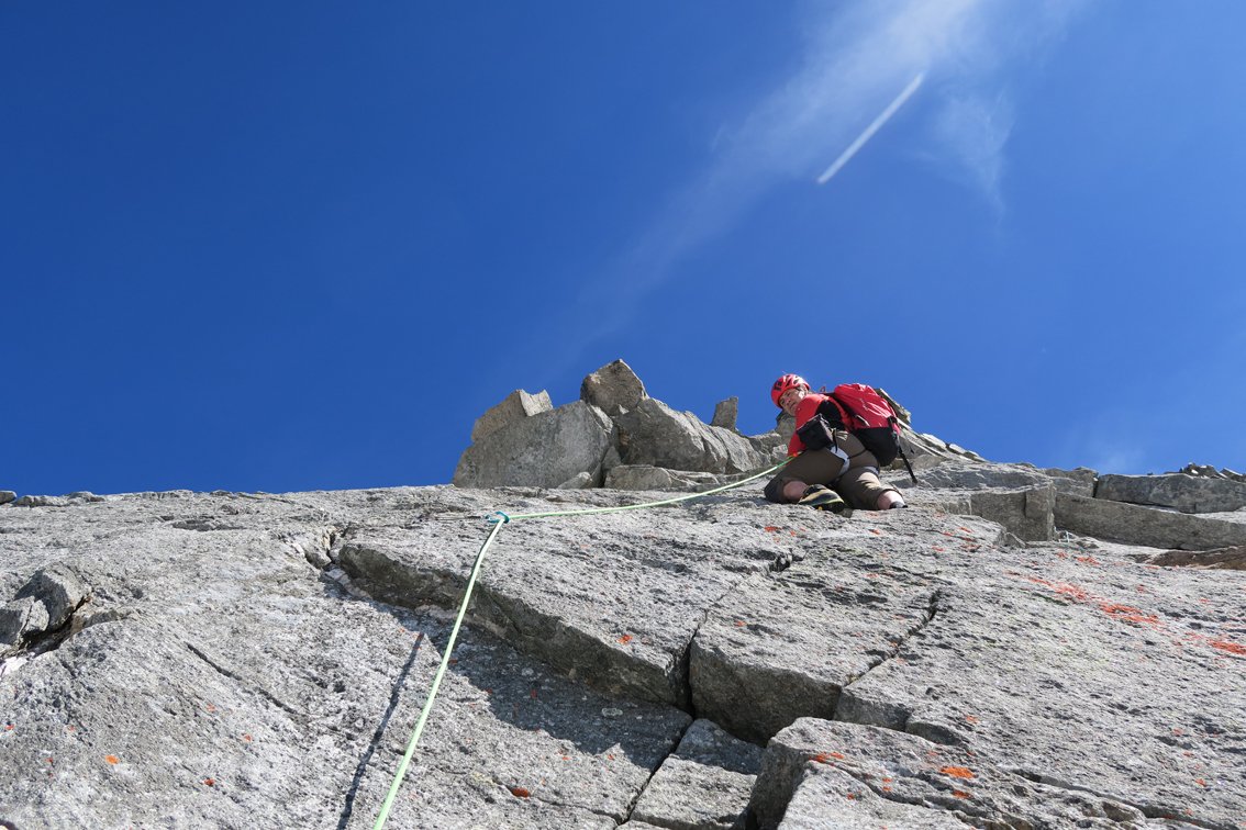 In der Schlüsselseillänge gibt es zwei Standplätze und einige Bohrhaken, der Rest des Grates ist je nach Bedarf selbständig abzusichern.