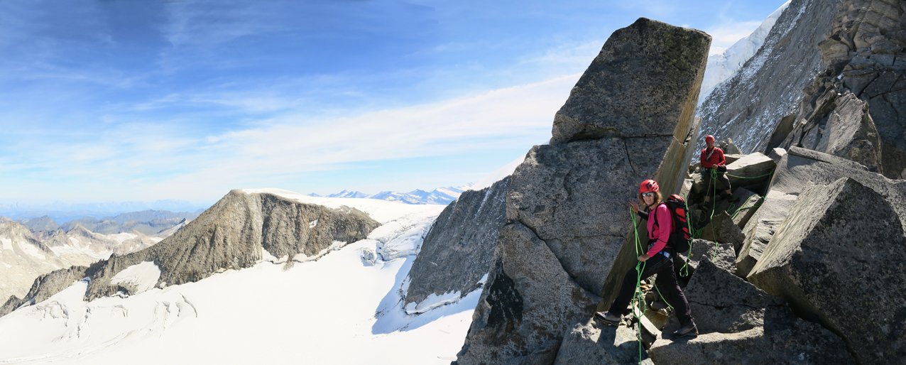 Siehe auch Topo: Von der Stange auf ca. 3295 m folgt man dem schmaler werdenden Grat. Bei einem Turm muss man steil hinunter (3, fixer Keil an der Kante), unten wird das Gelände leichter (1). Man überklettert den nächsten Aufschwung (2- und 1-2) und gelangt in die kleine Keidel-Scharte. Von dort weiter im Bereich des Grates höher (1-2), oben auf dem Grat dann zum Torwächter (3465 m). Vom "Gipfel" einfach hinunter zur Meynow-Scharte. Links vom Grat länger steil hinauf (2-3), bis der Grat wieder flacher wird (1-2). Auf dem Grat weiter (1-2 und leichter) bis sich dieser wieder stark aufstellt. Die Schlüsselpassage beginnt mit einem breiten Riss, danach leicht rechtshaltend zu einem roten Normalhaken. Von diesem links hinauf zu Haken. Die kleinen Stufen rechts werden links umgangen, danach folgt wieder leichteres Gelände. Am Ende dem leichten Blockgrat bis zum Gipfel folgen.