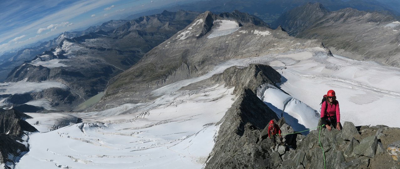 Vom Gipfel östlich auf dem oberen Keesboden des Schlatenkeeses zur Venedigerscharte (3407 m) absteigen. Dort dann in Richtung Norden (kurz steiler, sehr große Spalten!) hinunter auf das Obersulzbachkees und im Bogen wieder zurück zur Kürsingerhütte.