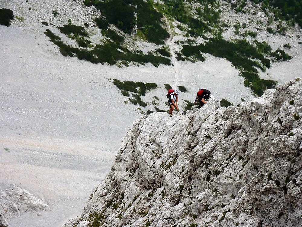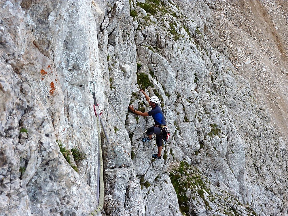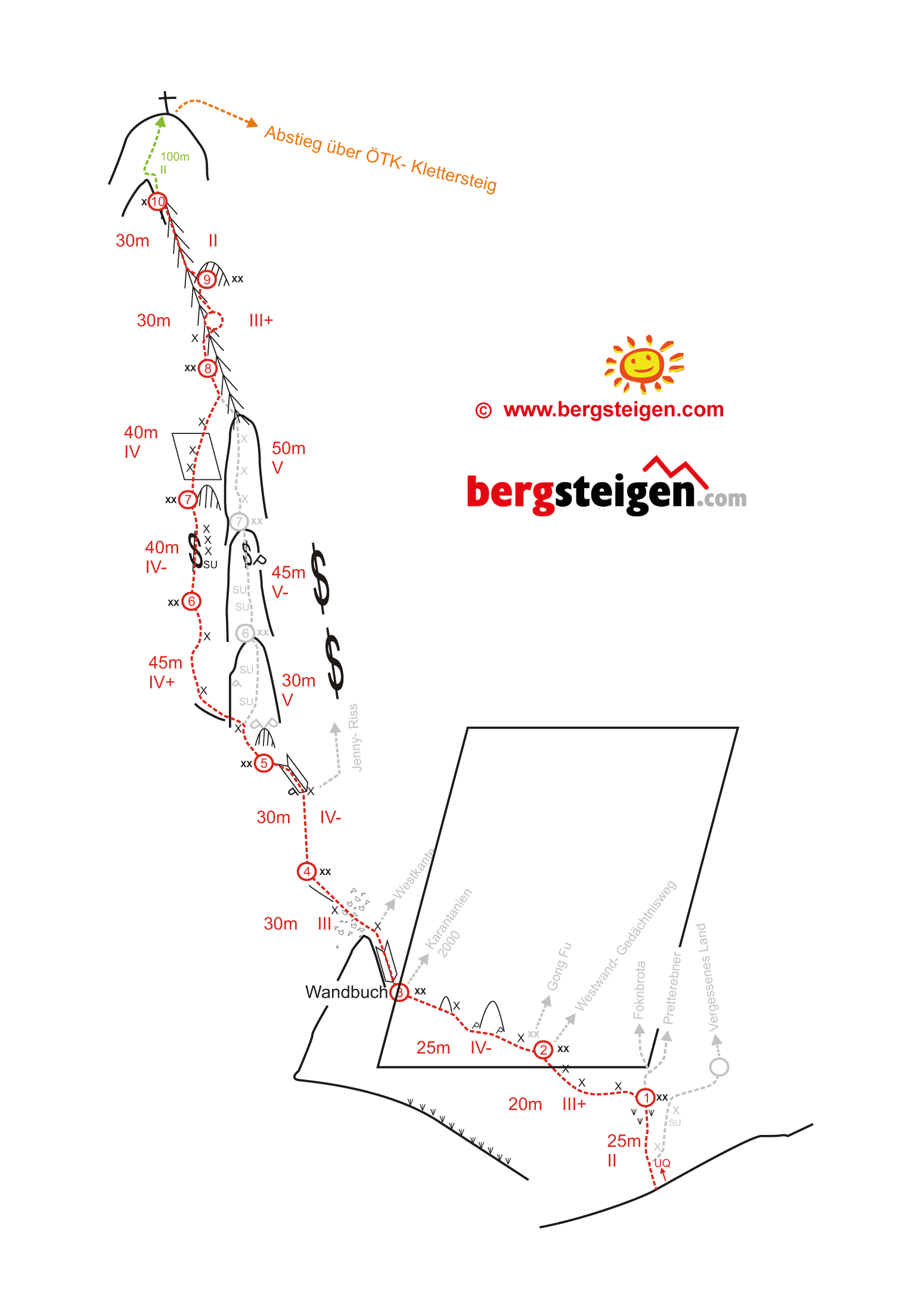 Vom Gipfel auf markiertem Steig 10-15min nach Westen absteigen bis zu einer Scharte. Einige Meter aufwärts zum Beginn des ÖTK-Klettersteigs bei einer blauen Tonne. Über den Klettersteig (B bzw. B/C) hinab und über das Schotterfeld zurück zum Einstieg. Weiterer Abstieg wie Aufstieg.