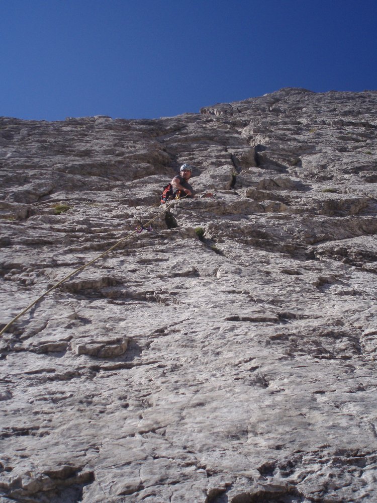 Siehe Topo. Die Schlüsselstelle (4) ist fast ganz oben an der luftigen Kante in der vorletzten Seillänge, meist ist die Kletterei um 3/3+ und leichter.
