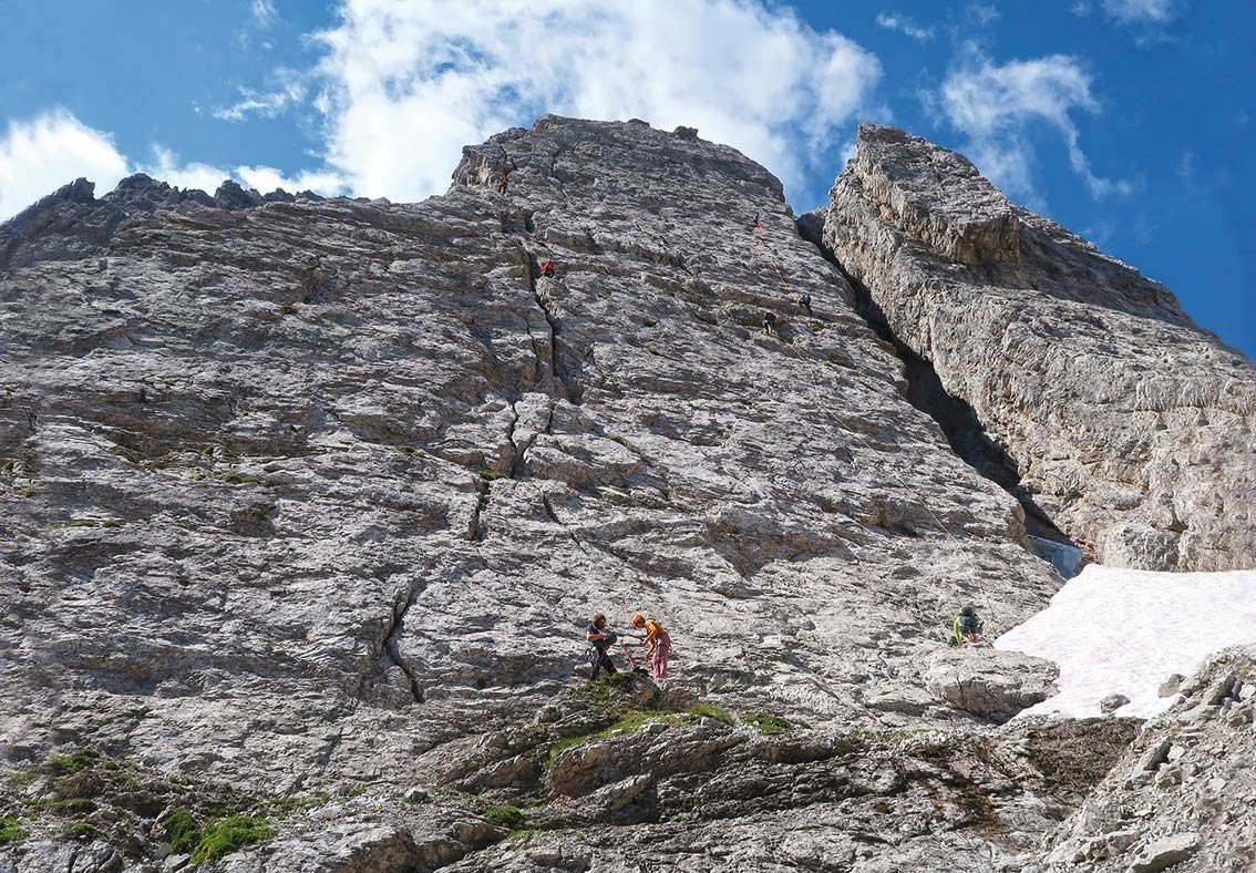 Der Anstieg auf der Nordostkante zur Kleinen Gamswiesenspitze ist ein sehr beliebter Genussklassiker, welcher auch gerne als Führungstour bei kurzen Abenteuerwochen gemacht wird. Die Kletterei führt über einen Mix von Platten, Rissen und kurzen Kaminen, wobei sich das Highlight ganz oben an der luftigen Kante befi ndet. Vom Gipfel hat man einen perfekten Ausblick in den Laserzkessel und im Norden sogar bis zum Großglockner. Der Anstieg gehört zu den kürzeren Alpinrouten in den Lienzer Dolomiten und der Abstieg wurde durch einen Klettersteig etwas erleichtert. Ein Manko kann der meist recht große Andrang sein, versierte Kletterer weichen dann auf die Gamsplatte (5-) rechts daneben aus (siehe Topo).
