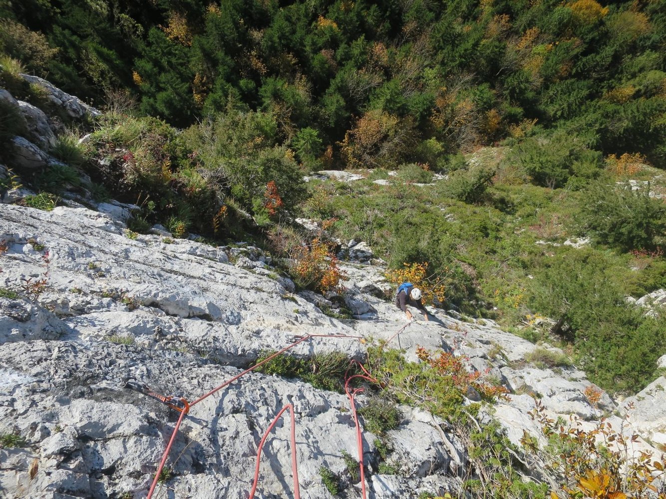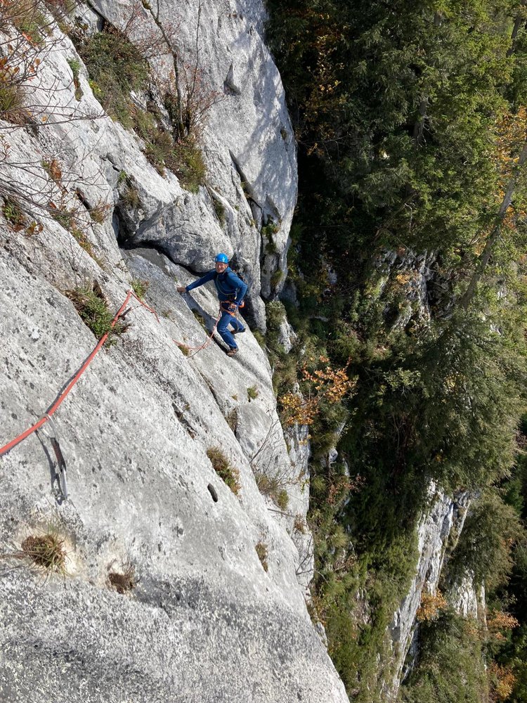 Gut mit Bohrhaken durchgesichert, in der Variante "Zum ohoitn" ist in der 2. SL 2 x (zum 1. Bolt und bei der Linksquerung oben) ein weiterer Abstand.