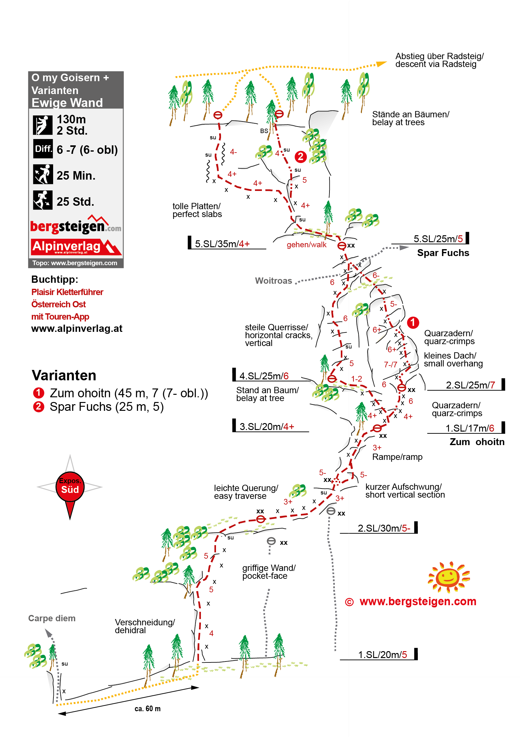 Sehr schöne und gut abgesicherte Route an der Ewigen Wand. Nach der zweiten Seillänge zweigt rechts die Variante "Zum ohoitn" (43 m, 7) und führ über einen großartigen Quarzpfeiler. Die Kletterei ist Ewige Wand typisch und erfolgt an Verschneidungen, Platten mit Quarzstreifen und Querrissen. Die Route bietet einen grandiosen Ausblick auf den Hallstätter See und den Dachstein.