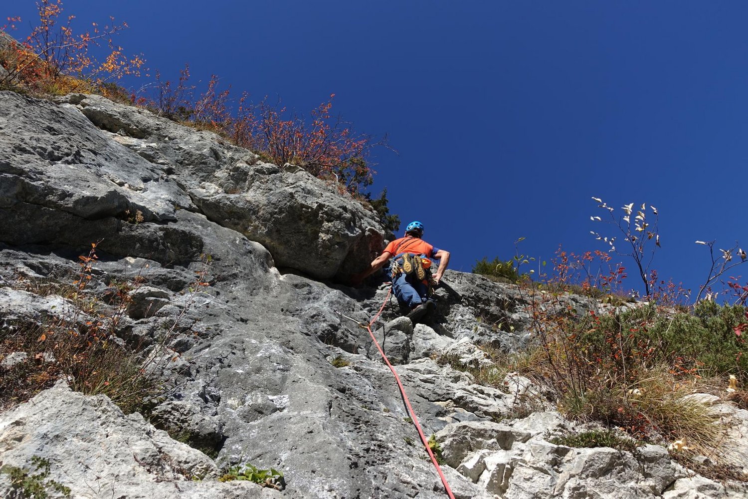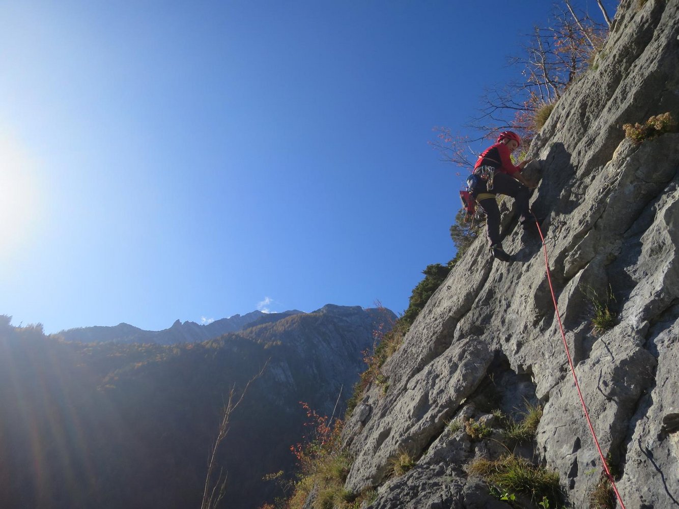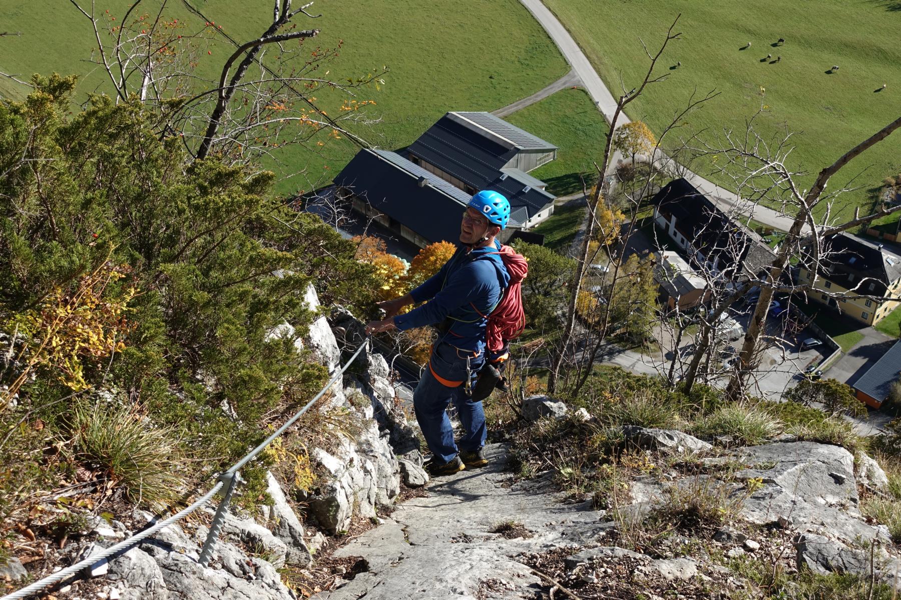 Bei der Drahtseilquerung keinen Steinschlag auslösen, da darunter einige Einseillängenrouten sind.