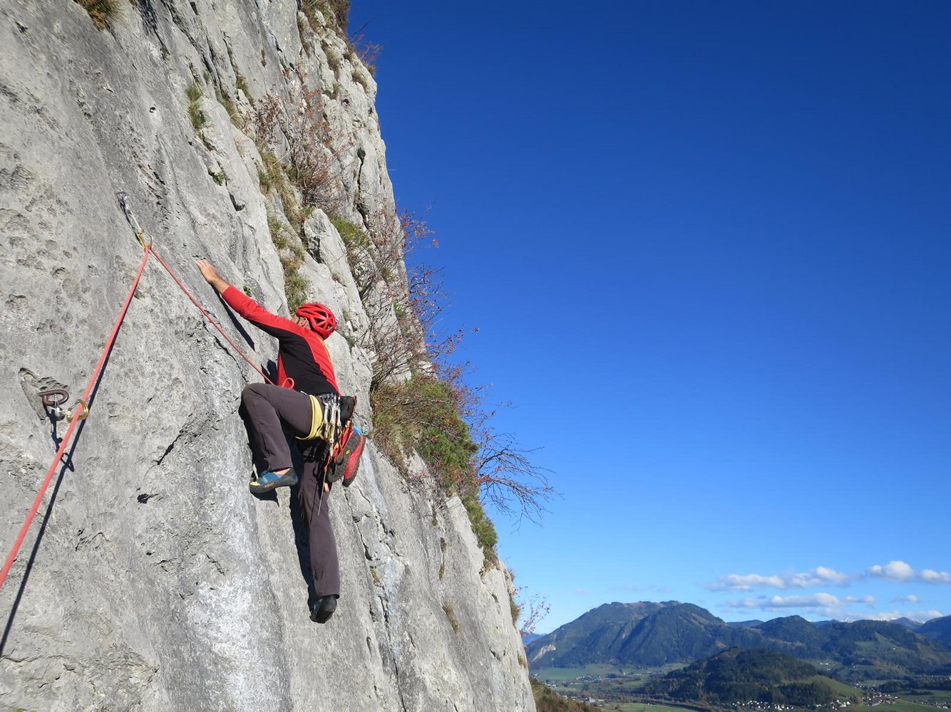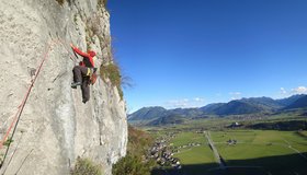 Durchaus ansprechende, einfache und klassische Route durch die obere Burgstallwand. Die Kletterei wird nach der 2. Seillänge durch eine Drahtseilquerung unterbrochen. Danach folgen noch vier kurze Seillängen.