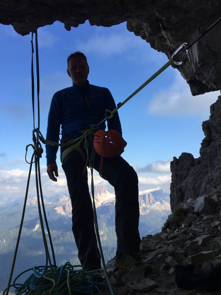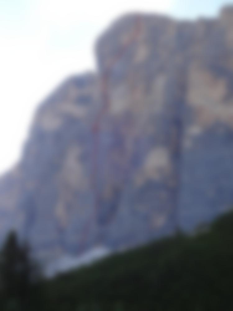 Die Ode an die Freunde verläuft über den 4. Pfeiler der Südwand der Tofana di Rozes. Die erste Seilelänge startet knackig mit einer 8-Stelle.