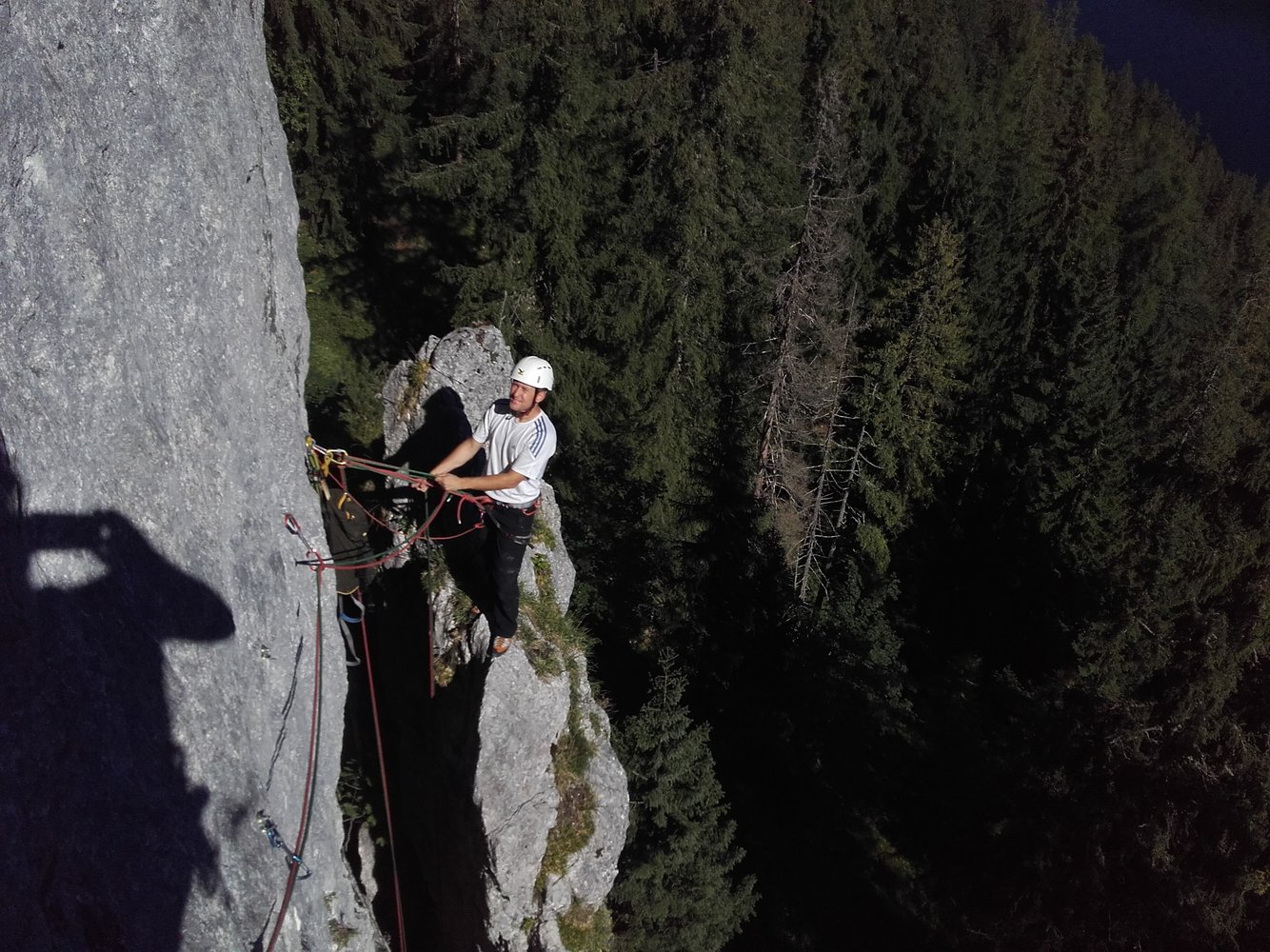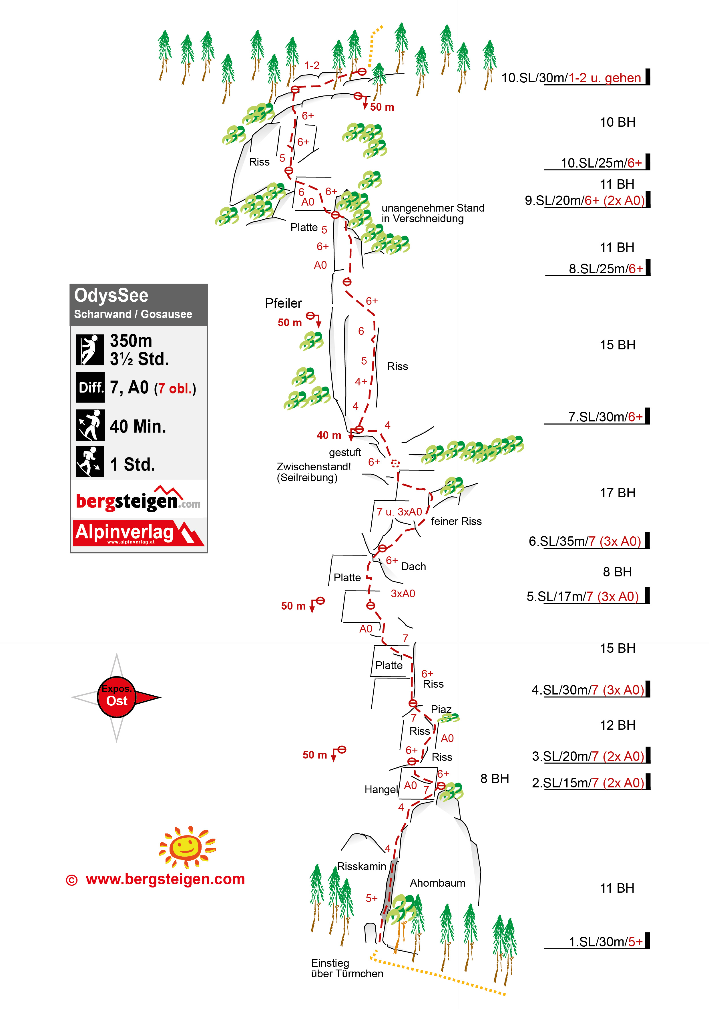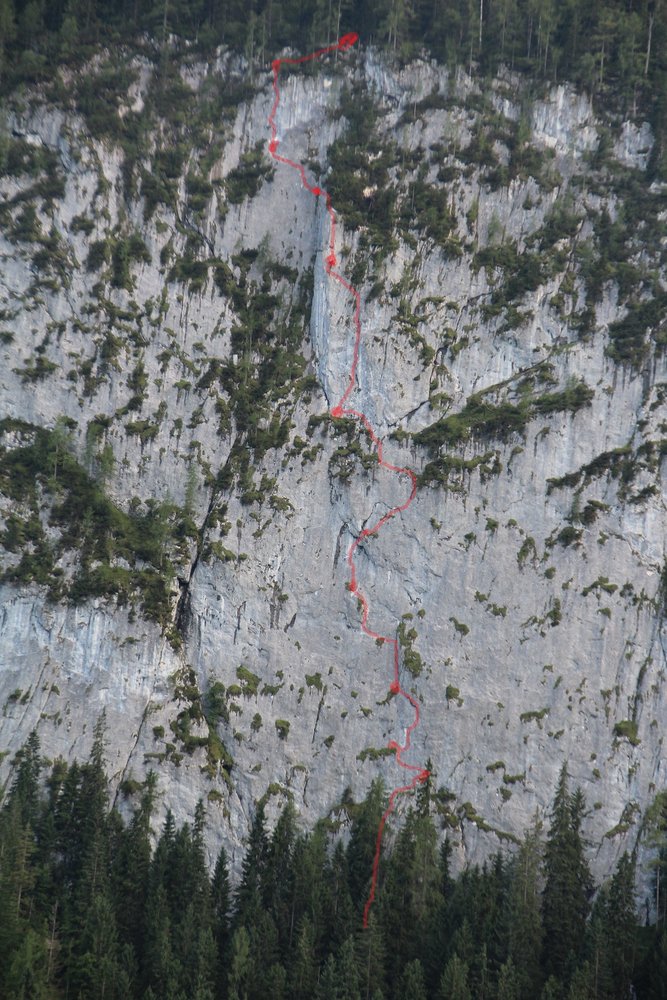 Die derzeit längste und schwierigste Route in der Scharwand, die noch auf ihre freie Begehung wartet. Mit 7 AO bzw. A1 kommt man aber durch die kompakten, steilen Platten.